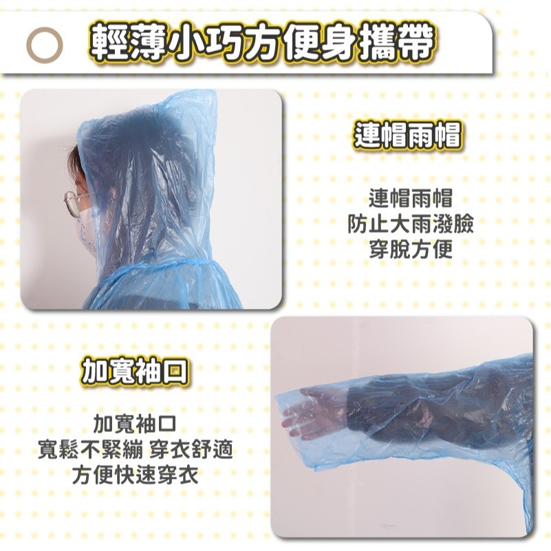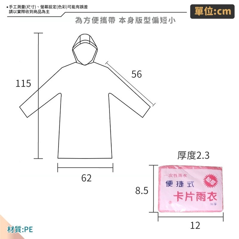 ⚠️因為了方便攜帶,雨衣本身長度覆蓋面積不大,袖口領口皆無抽繩設計,長度不及膝蓋,適合應急使用。顏色隨機不挑色。⚠️