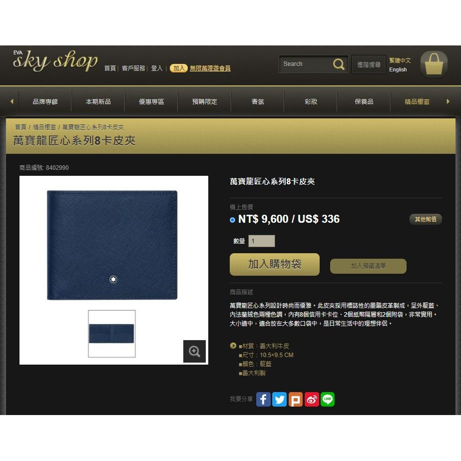 [長榮航空機上代購正品]萬寶龍匠心系列8卡皮夾-靛藍