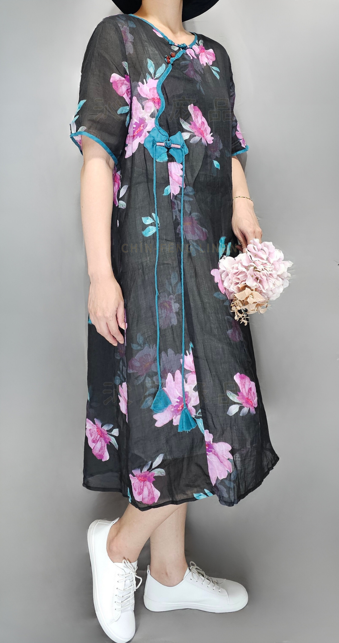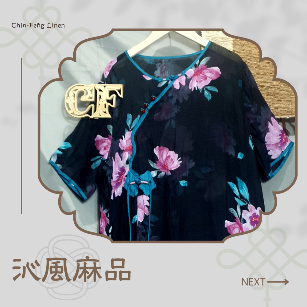 產品特色:藍綠色滾邊,全版印花,珠扣及腰帶裝飾,內縫包邊不扎皮膚,布料輕透不悶熱。