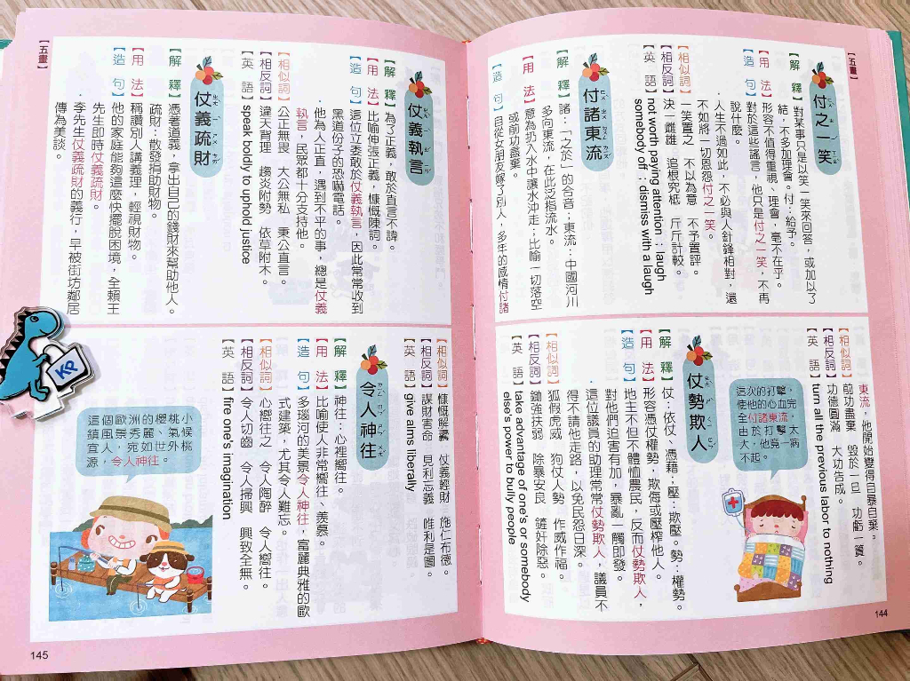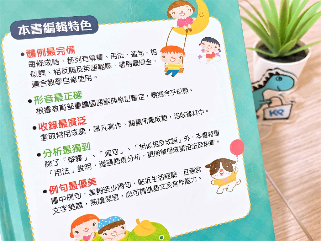 每條成語,都列有解釋、用法、造句、相似詞、相反詞及英語翻譯,體例最周全,適合教學、自修。並根據教育部重編國語辭典修訂審定,讀寫合乎規範。