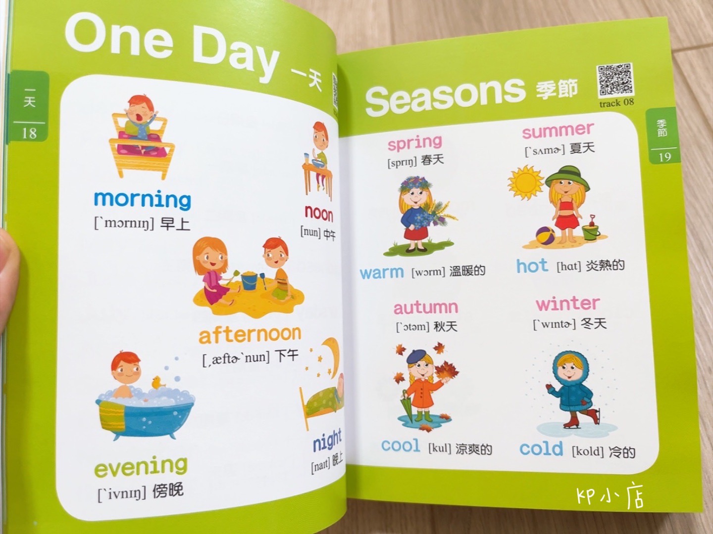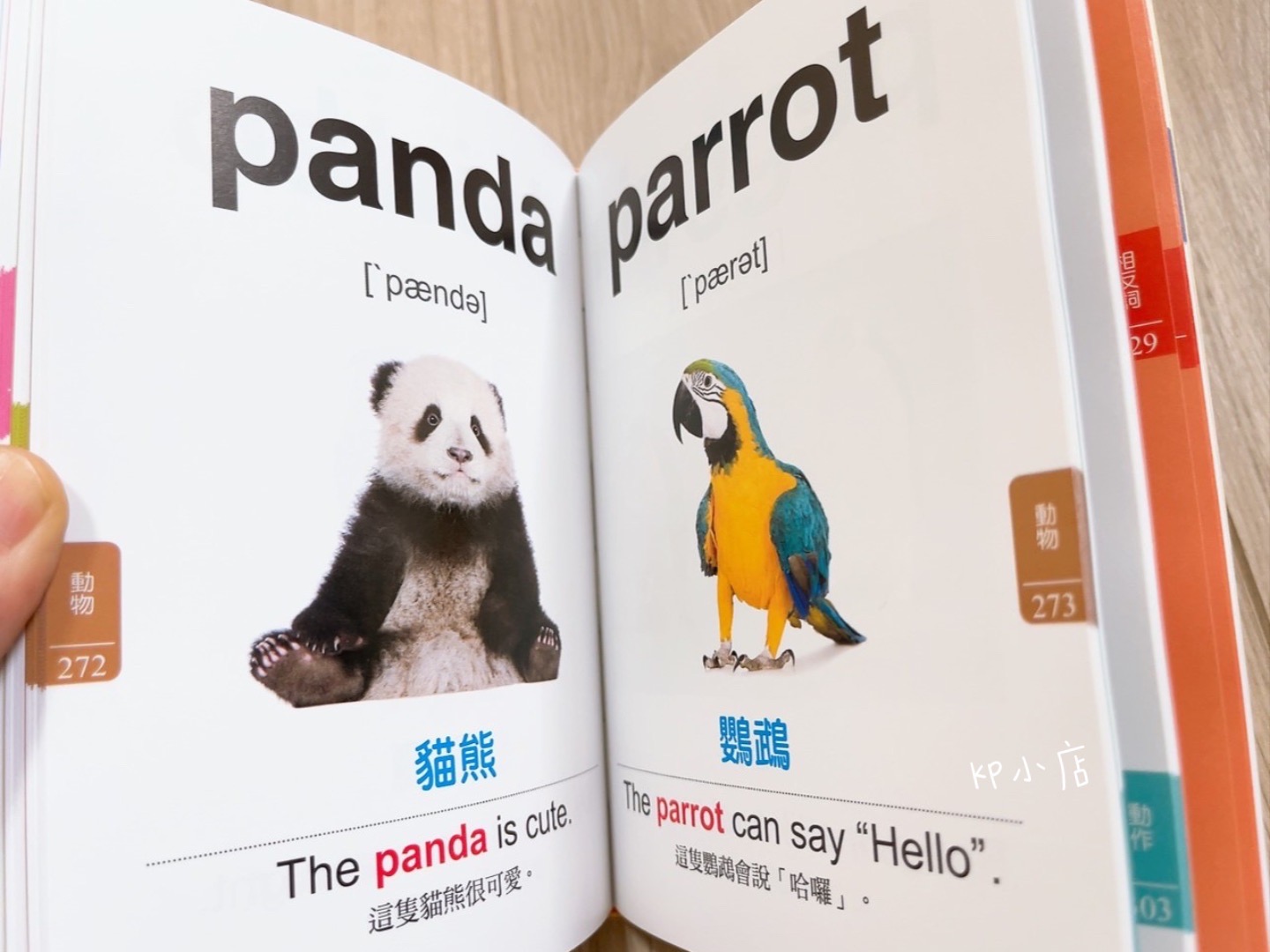 以物品、衣服和配件、交通工具、水果和蔬菜、動物等,孩子最熟悉的生活主題,收錄最常用的單字,搭配真實圖片,讓孩子在中英文的名稱之間快速連結,輕鬆記住單字。