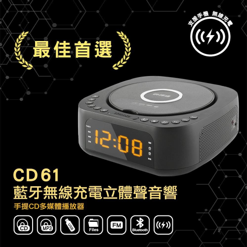 功能超強 產品使用需外接電源線 電池僅供時鐘/鬧鐘使用 完整支援多種格式及設備播放 可插記憶卡/USB/AUXFM廣播內建時鐘鬧鐘播放CD/DVD其他功能 額定電壓/頻率:AC110V/60Hz;2x1.5V("AAA"size,4號電池)時鐘供電用 曲目編輯:CD 20首/MP3-CD 99首 可播放類型:CD, MP3, MP3 CD, CD-R/RW 收音機頻率:FM87.5~108MHz 播放模式:重複播放 / 循環播放 / 隨機播放 輸出功率:1.5W x 1.5W 輸入型式:CD / USB / AUX IN / Bluetooth 廣播收音:FM(立體聲) 無線充電:10W 藍牙版本:3.0 尺寸:186 x 186 x 72mm (LxWxH) 重量:約0.65kg(不含電池) 其他:耳機插孔 / 鬧鐘功能 / LED顯示螢幕
