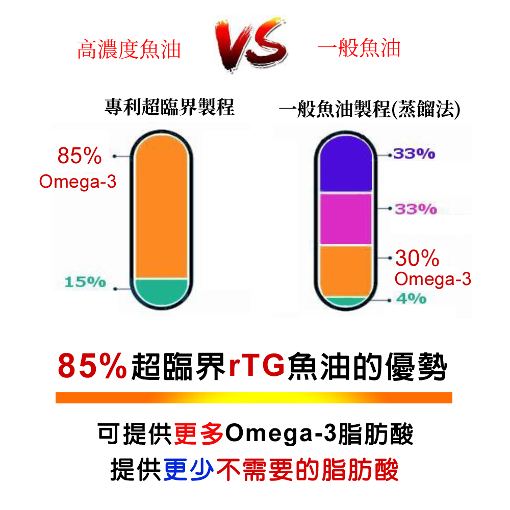 85%高濃度魚油,每粒魚油膠囊中的Omega-3脂肪酸佔了85%(EPA 48%、DHA 32%),那麼其它那些對人體不必要的脂肪酸,相對地所佔的比例就會很少了(15%)。但如果是30%低濃度魚油,則其他那些對人體不必要的脂肪酸就可能高達70%了,這樣您吃進去的究竟是Omega-3脂肪酸、EPA、DHA比較多,還是不必要的脂肪酸比較多呢? 很簡單就能比較出來了。