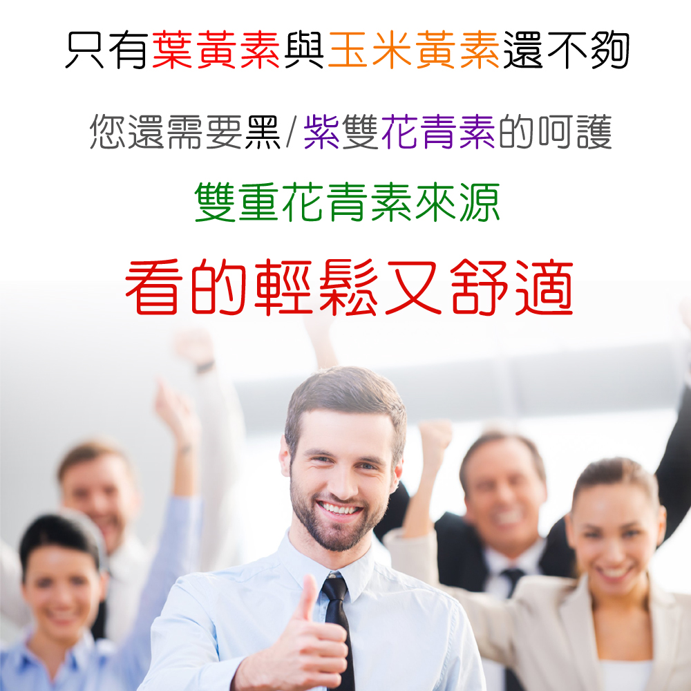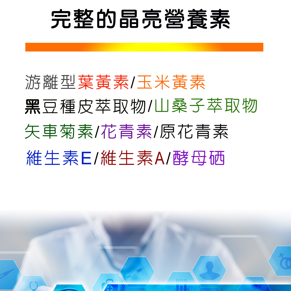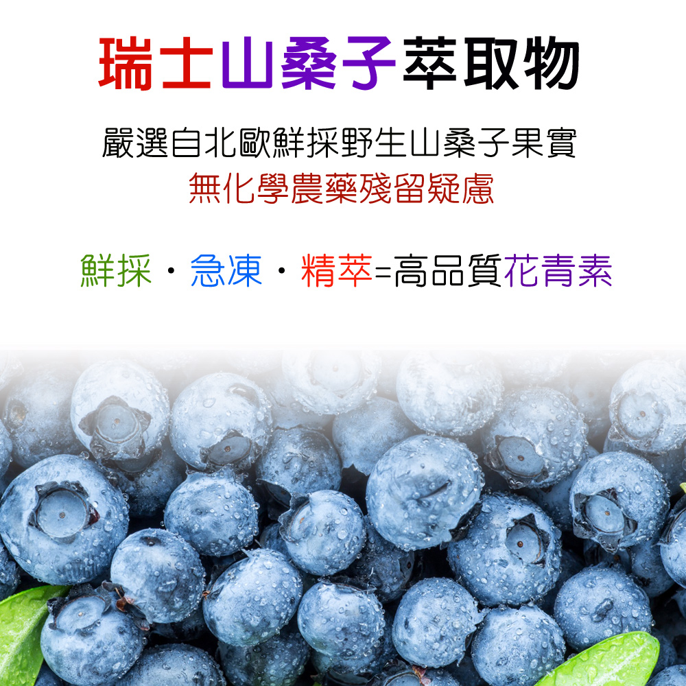 營養標示:每一份量1粒,本包裝含30份。維生素A 500微克(1667IU)、維生素E 8毫克(12IU)、硒 20微克、葉黃素 10毫克、玉米黃素 2毫克、黑豆皮萃取物 100毫克、瑞士山桑子萃取物(含花青素C3G 32%以上)