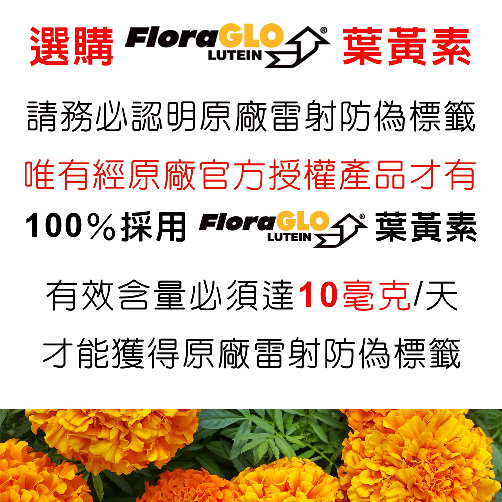 請注意:唯有正KEMIN原廠授權的FloraGLO®葉黃素商品,才會貼有FloraGLO® Lutein 雷射防偽標籤。