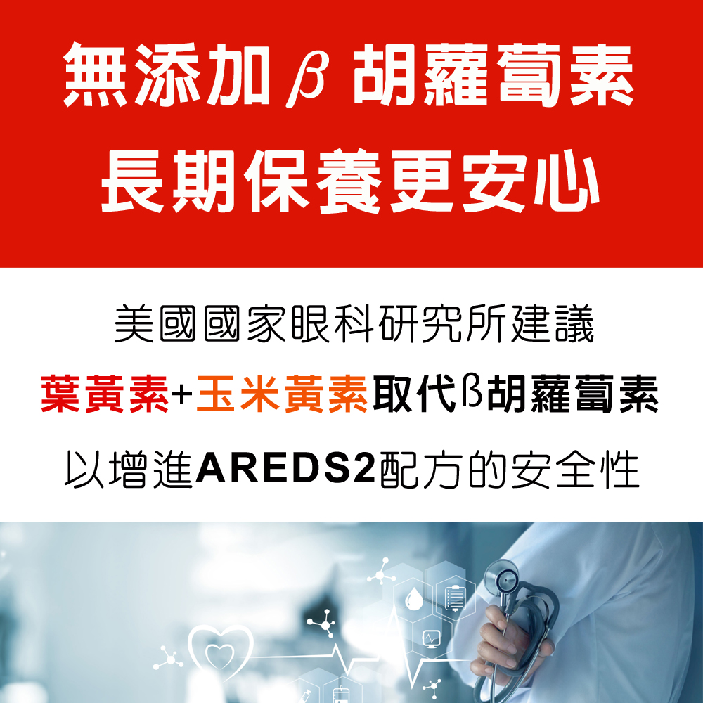 本品無添加β胡蘿蔔素,1994年的一項研究發現,攝取β胡蘿蔔素反增加抽菸者罹患肺癌的風險 ,因此美國國家衛生研究所建議以葉黃素+玉米黃素取代β胡蘿蔔素的補充,將會更安全有效。