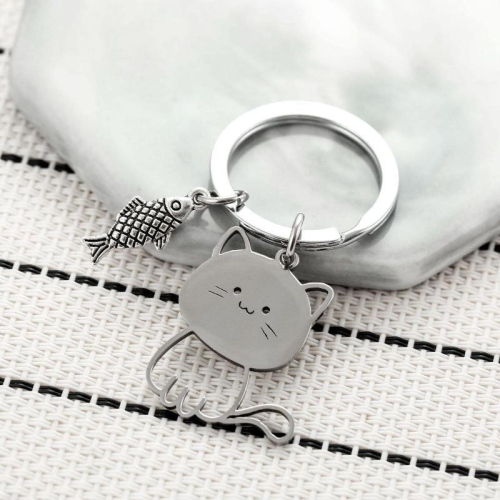 日系貓咪吃魚不鏽鋼鑰匙圈吊飾(一組2個)