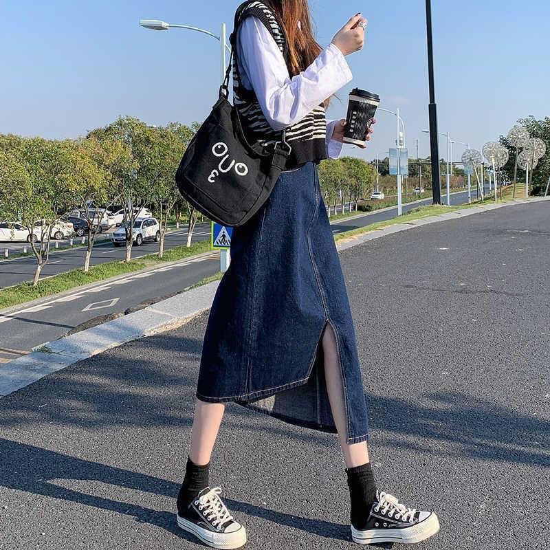KITTY雜貨舖~不對稱開叉牛仔長裙