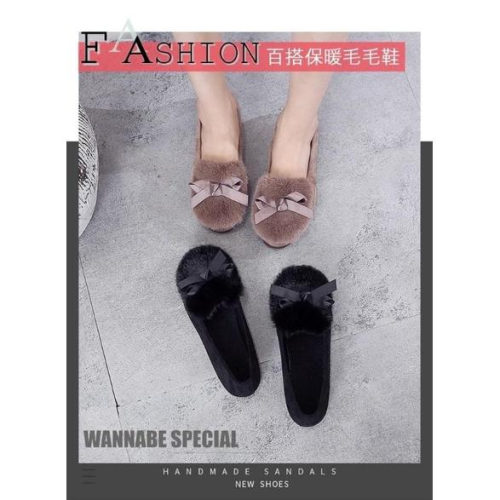 蝴蝶結加絨耐磨牛津軟底毛毛平底鞋