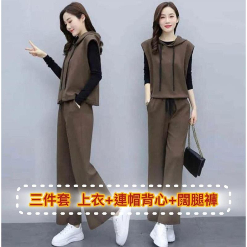 ✴️每套= 上衣+連帽背心+闊腿褲 ✅三件套 ❌外面隨便一條褲子就都要399、499元 😎這裡讓你一次買3件 💰跟工廠談甜甜價💕💕 🇰🇷韓國東大門🇰🇷🎉爆紅 🙏快供不應求了 ‼️喜歡的手刀速度,在考慮就斷貨了‼️ ❤️整身搭配好了❤️ ❤️也可拆件穿~自己穿搭👍🏻👍🏻👍🏻 🌸連帽背心,下擺鬆緊繩、自行調整 🌸闊腿褲,鬆緊褲頭、兩側口袋設計 🌸面料非常柔軟,手感很好👍🏻超舒服 🌸一整套穿一整年都通用~~ 🌸上衣、背心可以單獨搭配其他裙子褲子 🌸長褲又可以搭配其他T顏色 🌸耐看、顯瘦、好穿搭❤️ ✅材質:棉混紡 ✅尺碼 M: 背心-衣長55/胸圍100/肩寬46/褲長94cm腰圍鬆緊 L:背心-衣長56/胸圍104/肩寬47/褲長95cm腰圍鬆緊 XL:背心-衣長57/胸圍108/肩寬48/褲長96cm腰圍鬆緊 2XL:背心-衣長58/胸圍112/肩寬49/褲長97cm腰圍鬆緊 3XL:背心-衣長59/胸圍116/肩寬50/褲長98cm腰圍鬆緊 4XL:背心-衣長60/胸圍118/肩寬51/褲長99cm腰圍鬆緊條