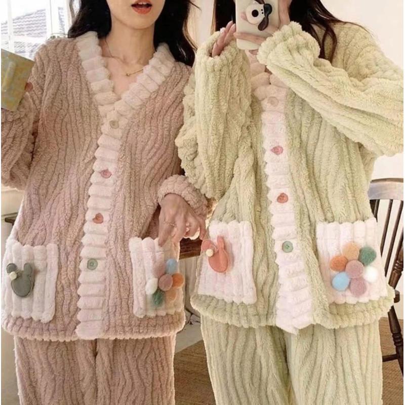 法蘭絨暖暖甜美花朵保暖睡衣套裝