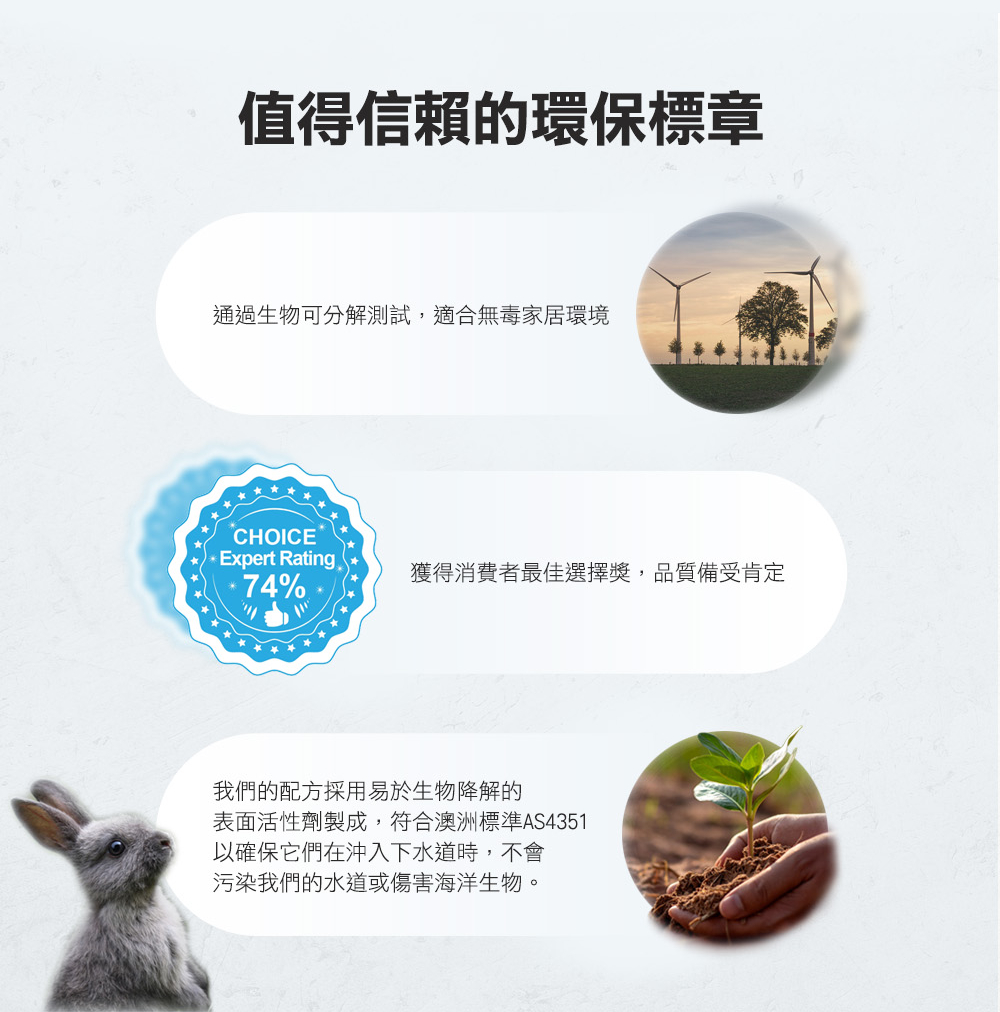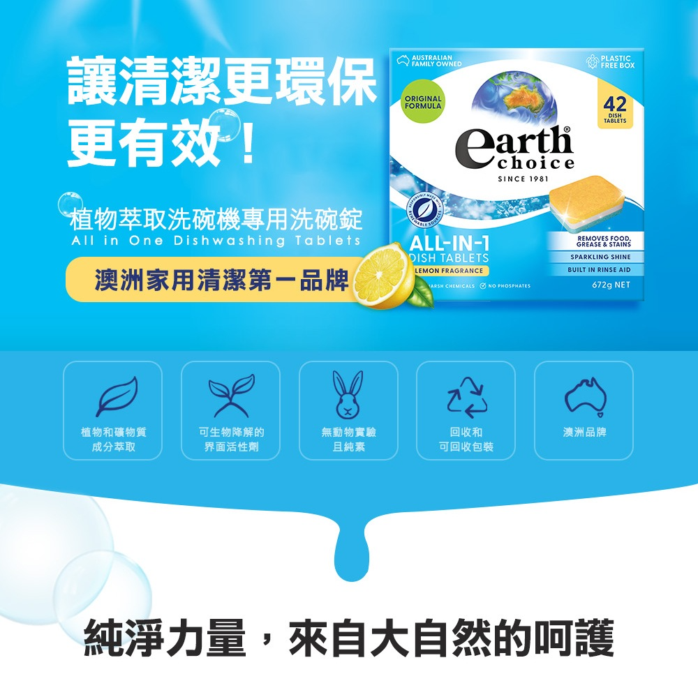 ★ Earth Choice成立已超過40年,為澳洲專業期刊Roy Morgan評比澳洲環保洗劑市占率第一品牌及CHOICE評比洗碗功效績優品牌(76%與Finish Ultimate Plus Material Care量子極淨洗碗凝珠同分)