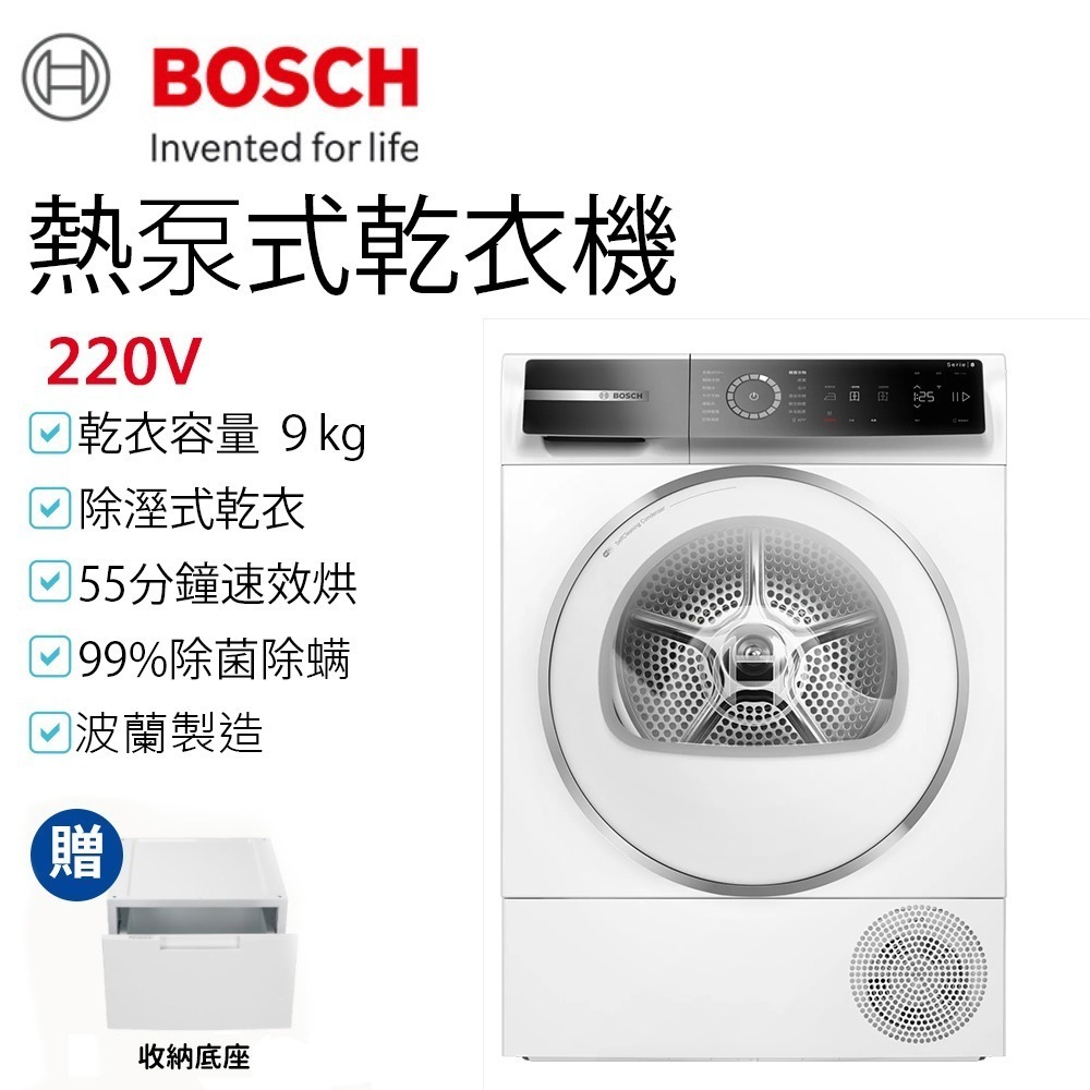 【BOSCH 博世】Heat Pump 熱泵速效乾衣機 9 kg WQB245B0TC 附收納增高底座