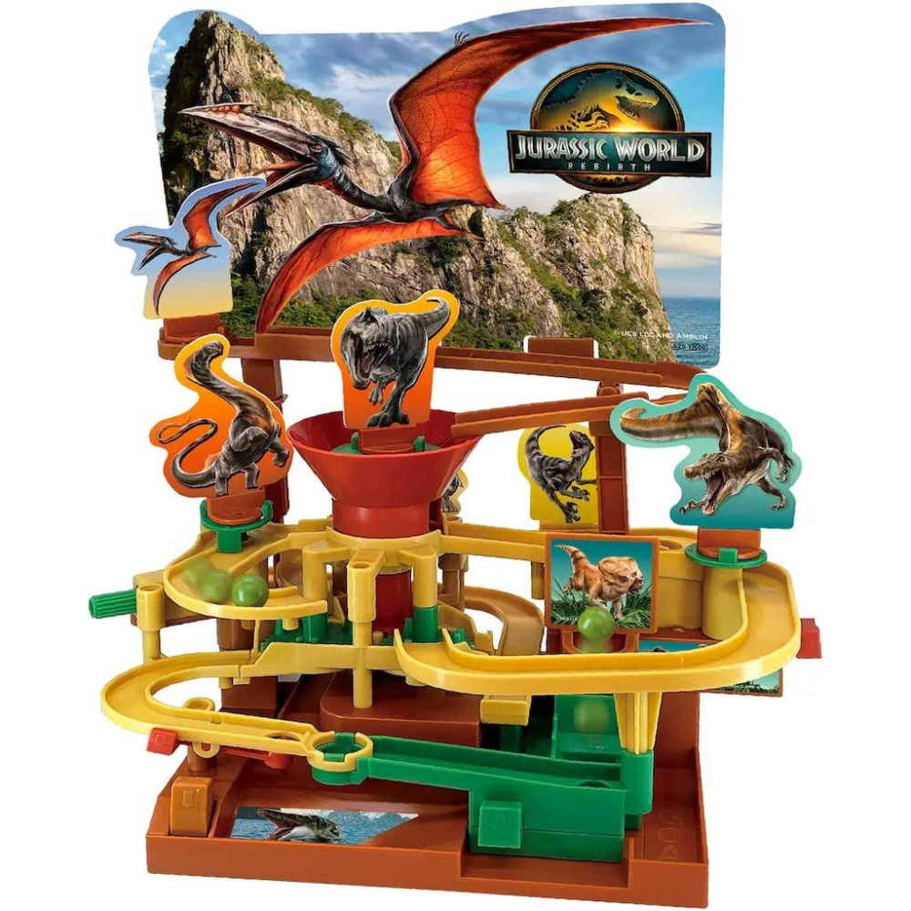 EPOCH Games Familienspiel »Jurassic World Rebirth Adventure Callenge« Ab 4 Jahren Für 1-4 Spieler Spieldauer ca. 15-30 Minuten Nervenkitzel pur! Das Jurassic World Adventure Game von EPOCH Games bringt actionreiche Missionen von der Kinoleinwand direkt ins Wohnzimmer. Die Herausforderung: Die Gyrosphäre sicher durch 10 knifflige Hindernisse manövrieren, ohne vom Weg abzukommen oder von gefährlichen Dinosauriern angegriffen zu werden. Mit Knöpfen und Reglern wird die Kugel geschickt durch das Labyrinth gelenkt. Jeder Schritt erfordert höchste Konzentration, denn Abweichungen könnten fatal sein. Das Ziel: die Gyrosphäre unversehrt ins Ziel bringen. Das innovative Link-System ermöglicht es, die 2D-Dinosaurier-Aufsteller durch beeindruckende 3D-Dinosaurier zu ersetzen, für noch realistischere Abenteuer. Spannende Unterhaltung für Kinder ab 4 Jahren und die ganze Familie – ideal für kleine Abenteuer- und große Dinosaurier-Fans! ProduktdetailsSpieldauer 15-30 min Anzahl Spieler 1-4 Inhalt Haupteinheit Luftstrecke 2 Kugel 6 Charakterplatten Aquilops-Spielfigur Flugeinheit Basiseinheit Säulen A und B Hintergrundtafel Stickerbogen
