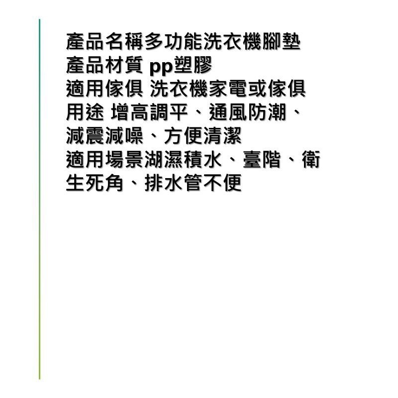 商品名稱:洗衣機腳墊 材質:塑料 製造商:義烏市吉茂日用品有限公司 進口商:圓肚精靈家族企業社 服務電話:0966851270 地址:桃園市八德區忠勇街60巷7號二樓 製造日期:2023/2 重量:70g 數量:1