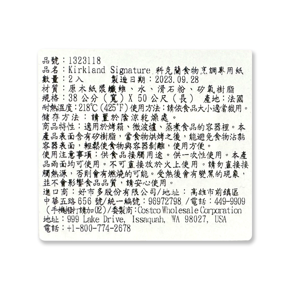 【商品名稱】Kirkland Signature科克蘭 食物烹調專用紙 38cmx50m 2入