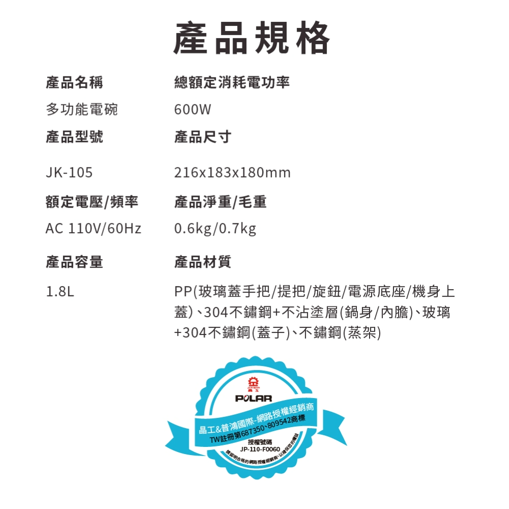 【商品名稱】Jinkon晶工 電碗 多功能1.8L JK-105