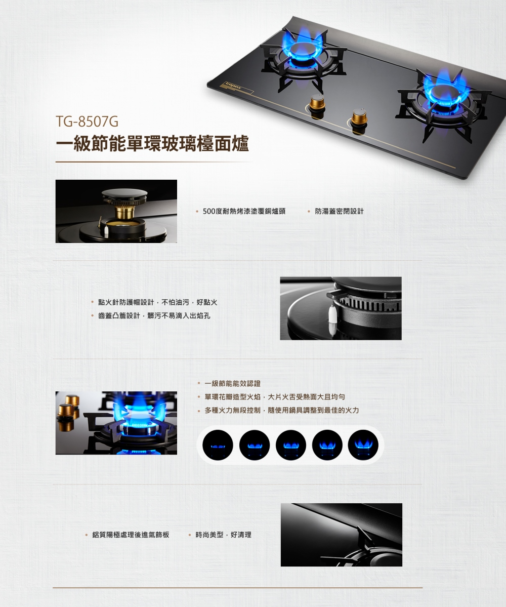 .單環花瓣式火焰,使火舌集中於鍋底,焰火不外逸。
