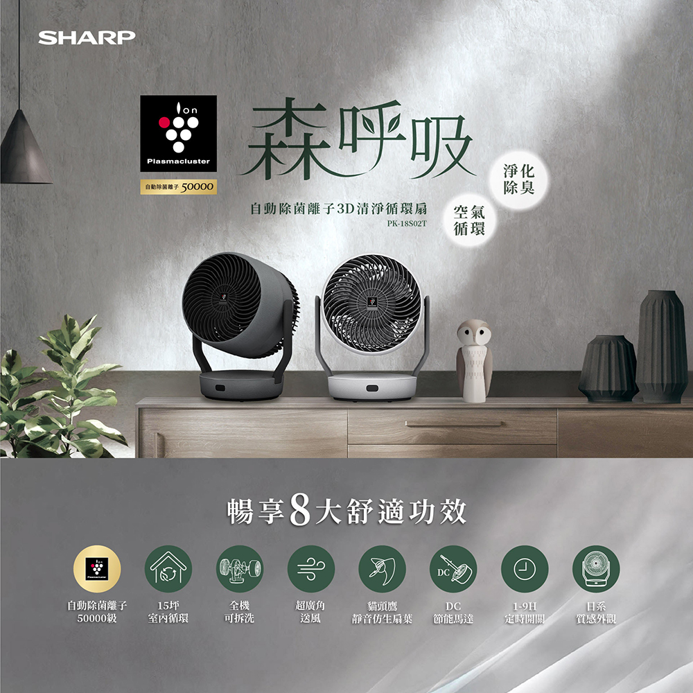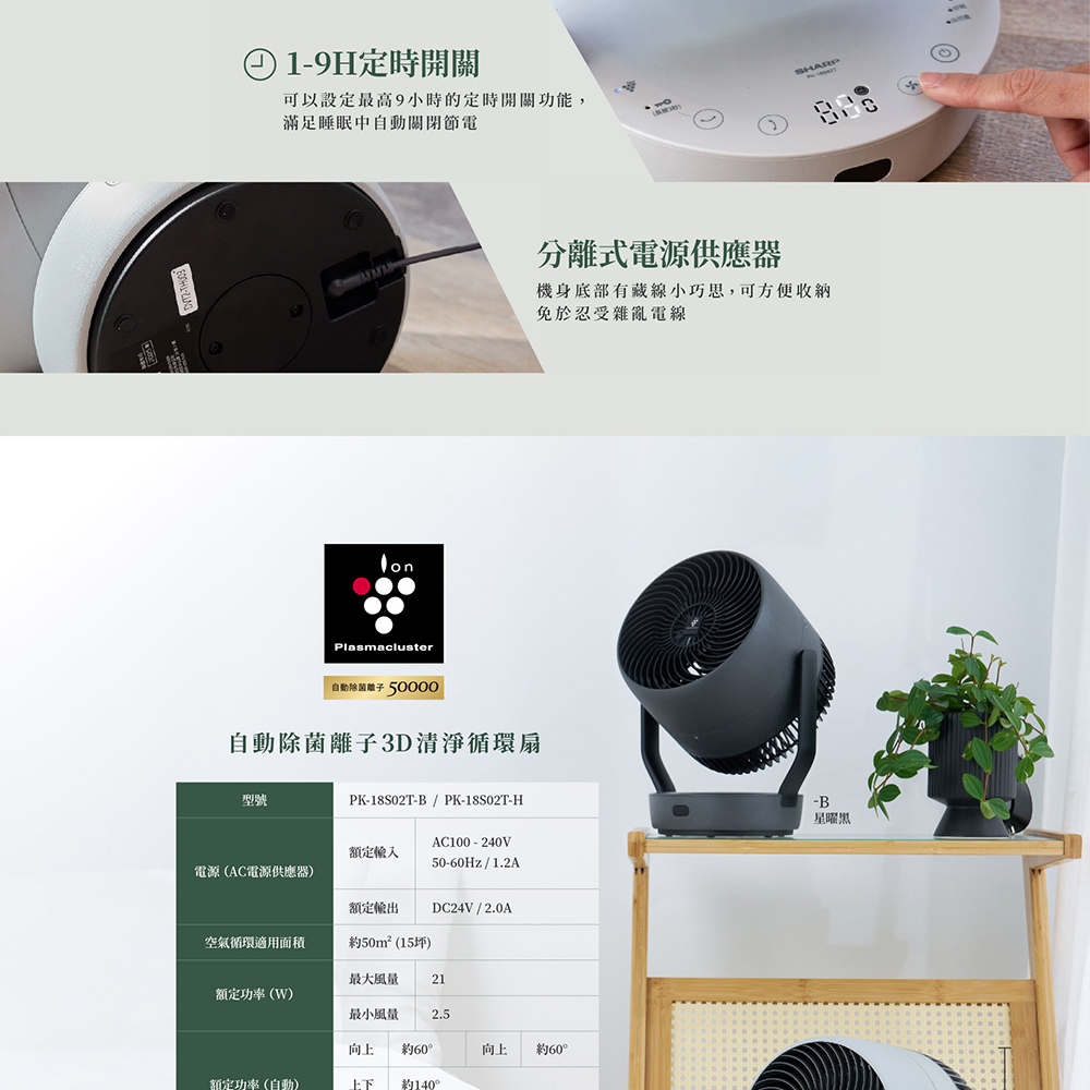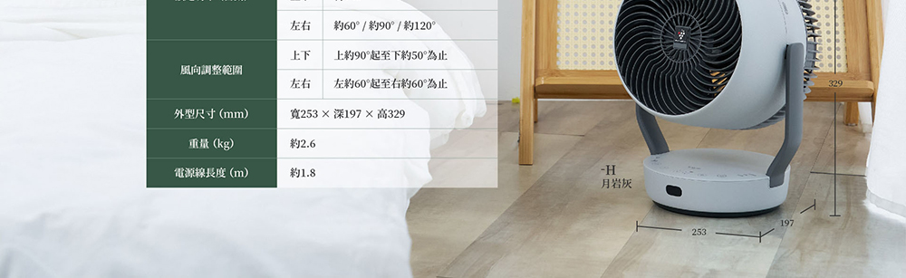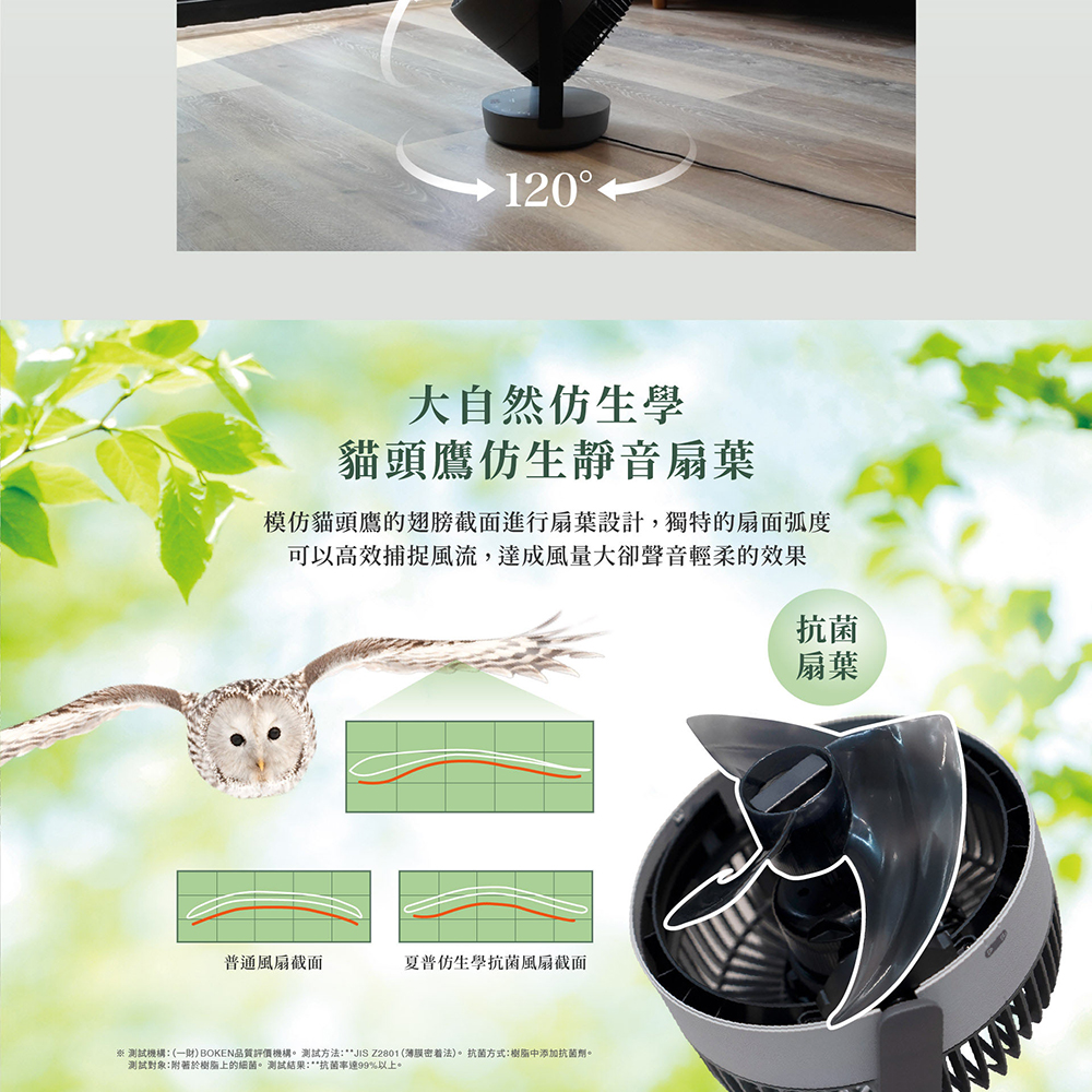 扇葉片數 : 3 (貓頭鷹仿生靜音扇葉) 風量段數 : 10 額定消耗功率 : AC100-240V 50-60Hz 1.2A (AC 電源供應器) DC馬達 : O 功能規格(風扇) (-) 自動除菌離子濃度 : 50000 除菌 : O 脫臭 : O 去除附著香菸臭味 : O 去除衣服半乾臭味 : O 自然風模式 : O 睡眠風模式 : O 無線遙控器(附收納架) : 磁吸式 遙控擺頭 : O 定時功能 : 1-9H 兒童安全鎖 : O 其它(風扇) (-) 電源線長度 : 約 1.8m 產品尺寸(cm) : 寬 25.3 × 深 19.7 × 高 32.9 產品重量(不包括附件) : 約 2.6 kg BSMI : R3B801
