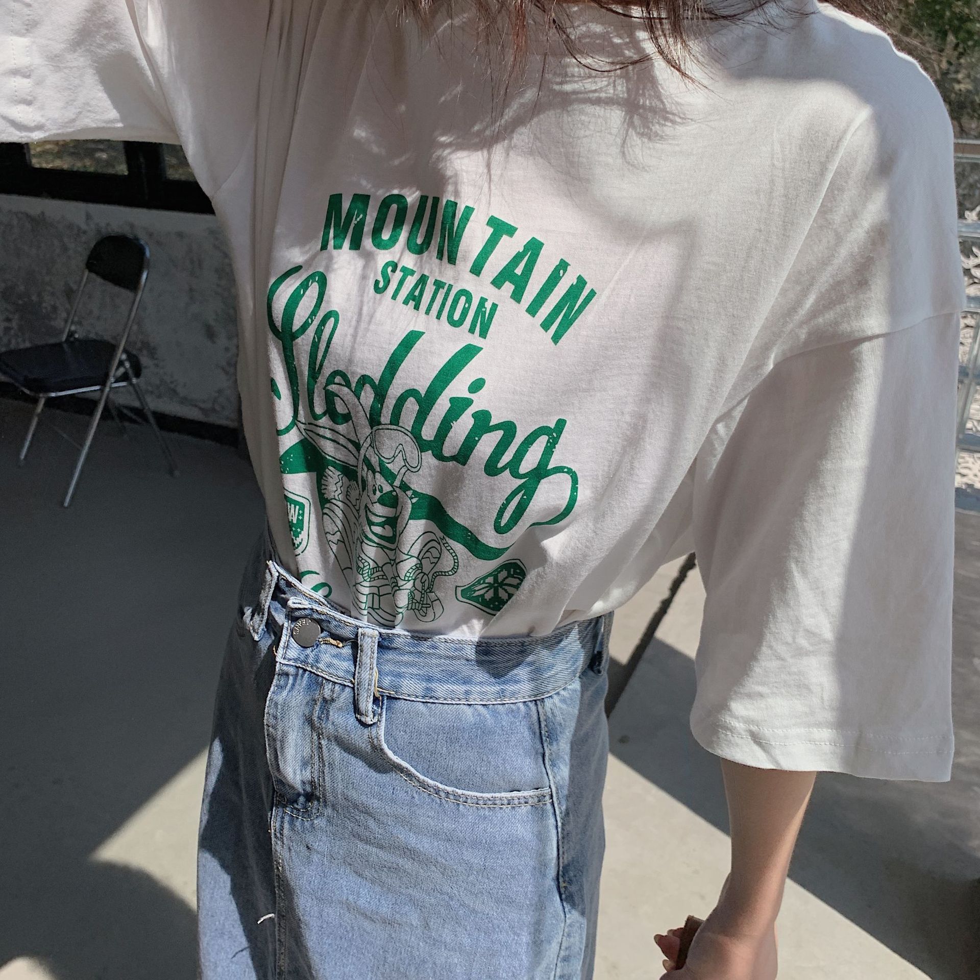 各位時尚女孩們!這件超可愛的韓版T恤來了~靈感來自復古山地滑雪主題,印上「Mountain Station Sledding Company」的綠色字樣和搞怪卡通人物(戴帽子的惡魔小人手持雪橇,配上雪花盾牌徽章),滿滿的趣味感和街頭風!白色底色清新百搭,無論搭配牛仔褲、短裙還是寬褲,都能輕鬆打造韓系休閒look。夏天必備單品,穿上它就像去山裡冒險一樣活力滿分!