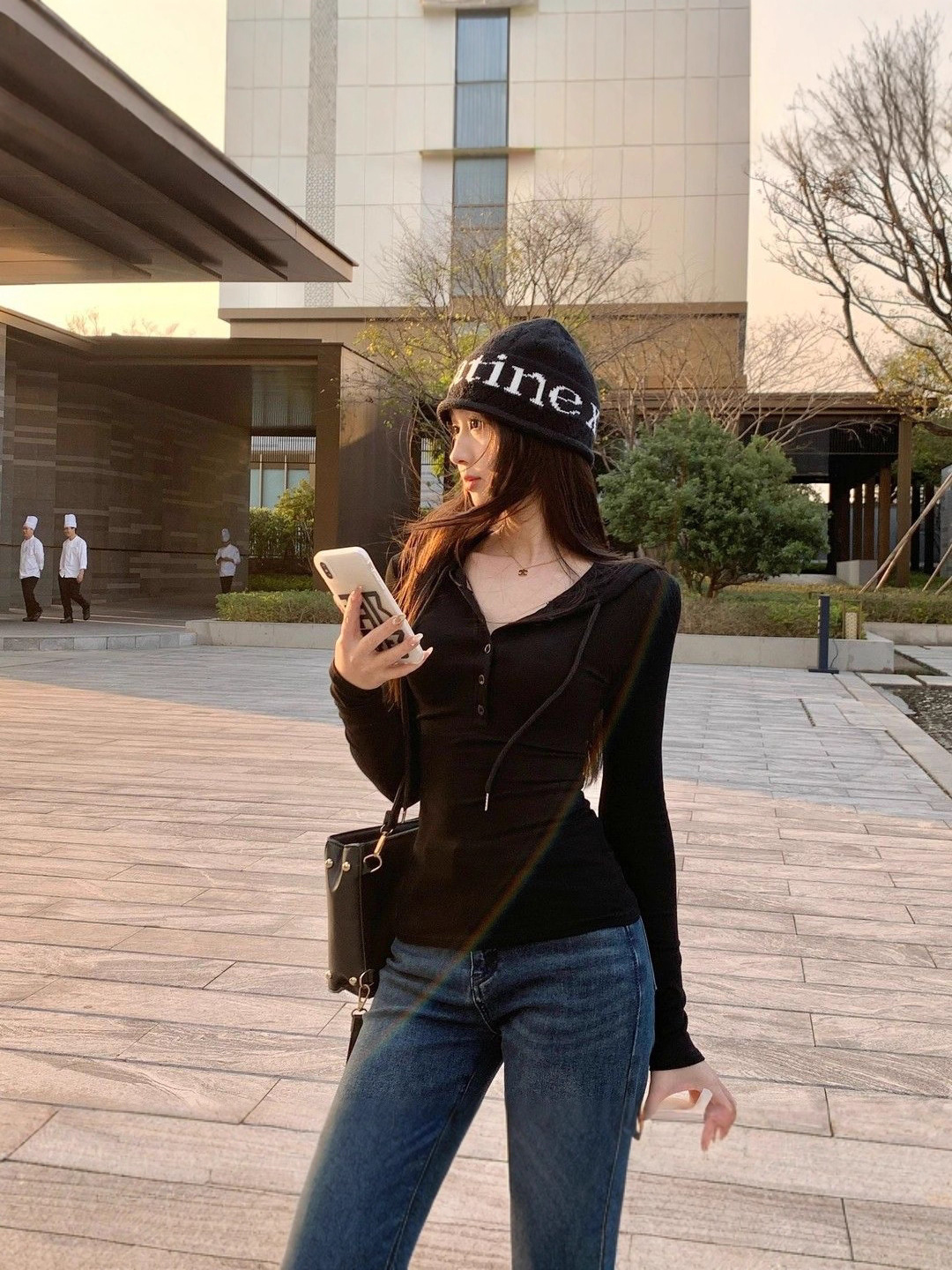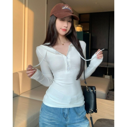 ✨新品上市!女性緊身長袖上衣 亨利領紐扣設計 連帽休閒T恤 顯瘦百搭神器✨