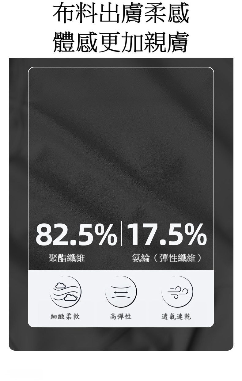 採用高品質面料:82.5% 聚酯纖維 + 17.5% 氨綸(彈性纖維),四面彈設計,彈性極佳,不易變形。