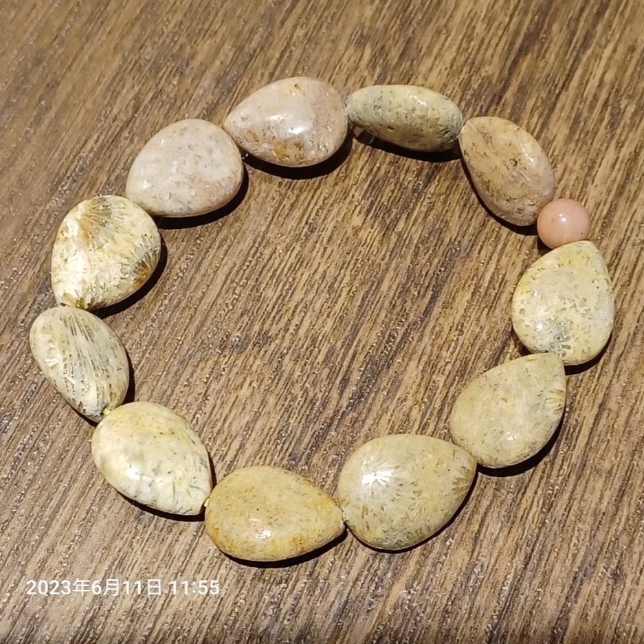 這也是屬造型款手錬。主石為珊瑚化石。水滴型造型。圓形小珠為圖畫石。為要增加整條手錬造型效果。喜歡造型石手串珠。看過來。