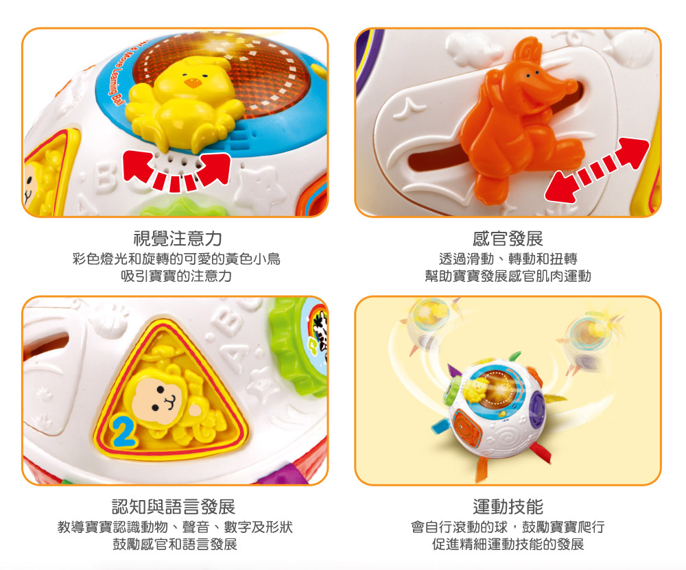 ‧教導寶寶認識動物、聲音、數字及形狀,鼓勵感官和語言發展。
