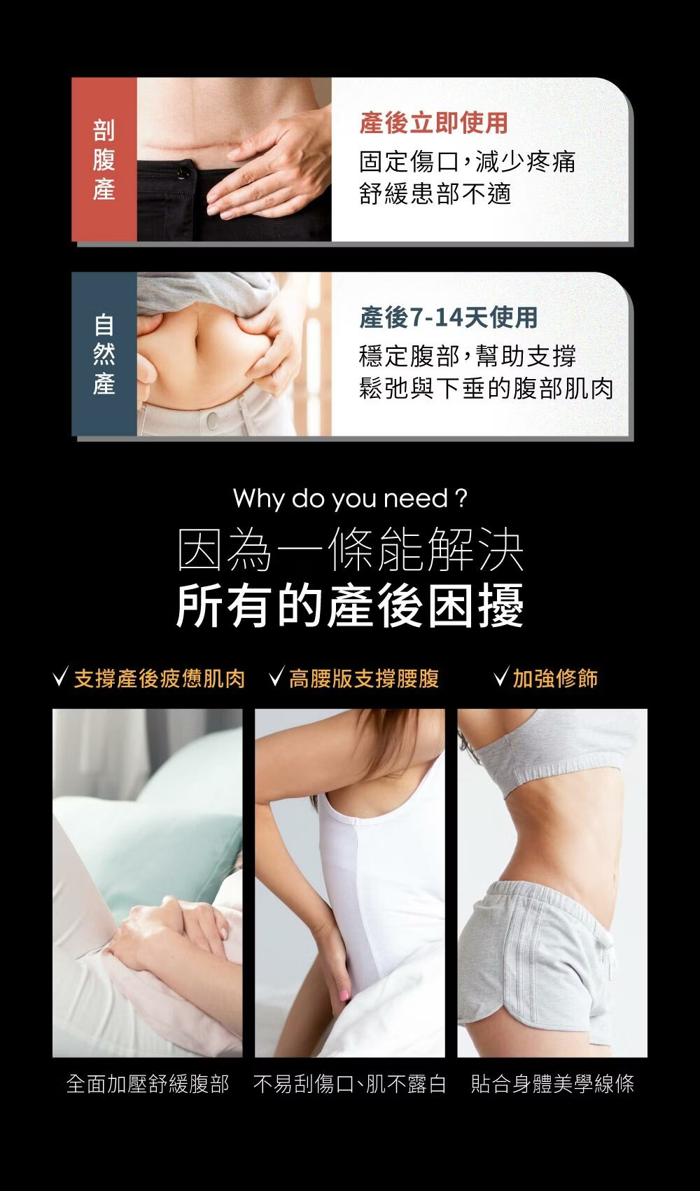 對於自然產的媽咪,穩定腹部,幫助支撐鬆弛與下垂的腹部肌肉。