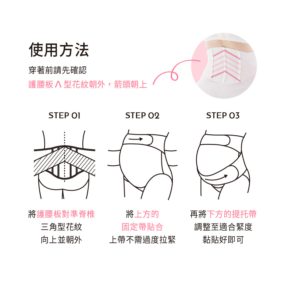 2.穿著前先確認,護腰板^型花紋朝外,箭頭朝上。