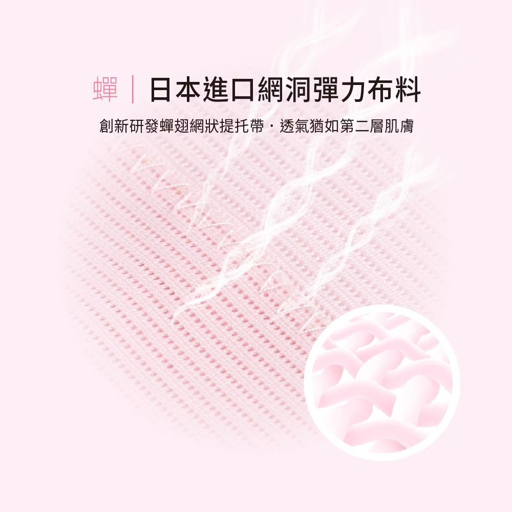 【透膚網帶】:輕量化網狀結構布,肌膚零負擔。