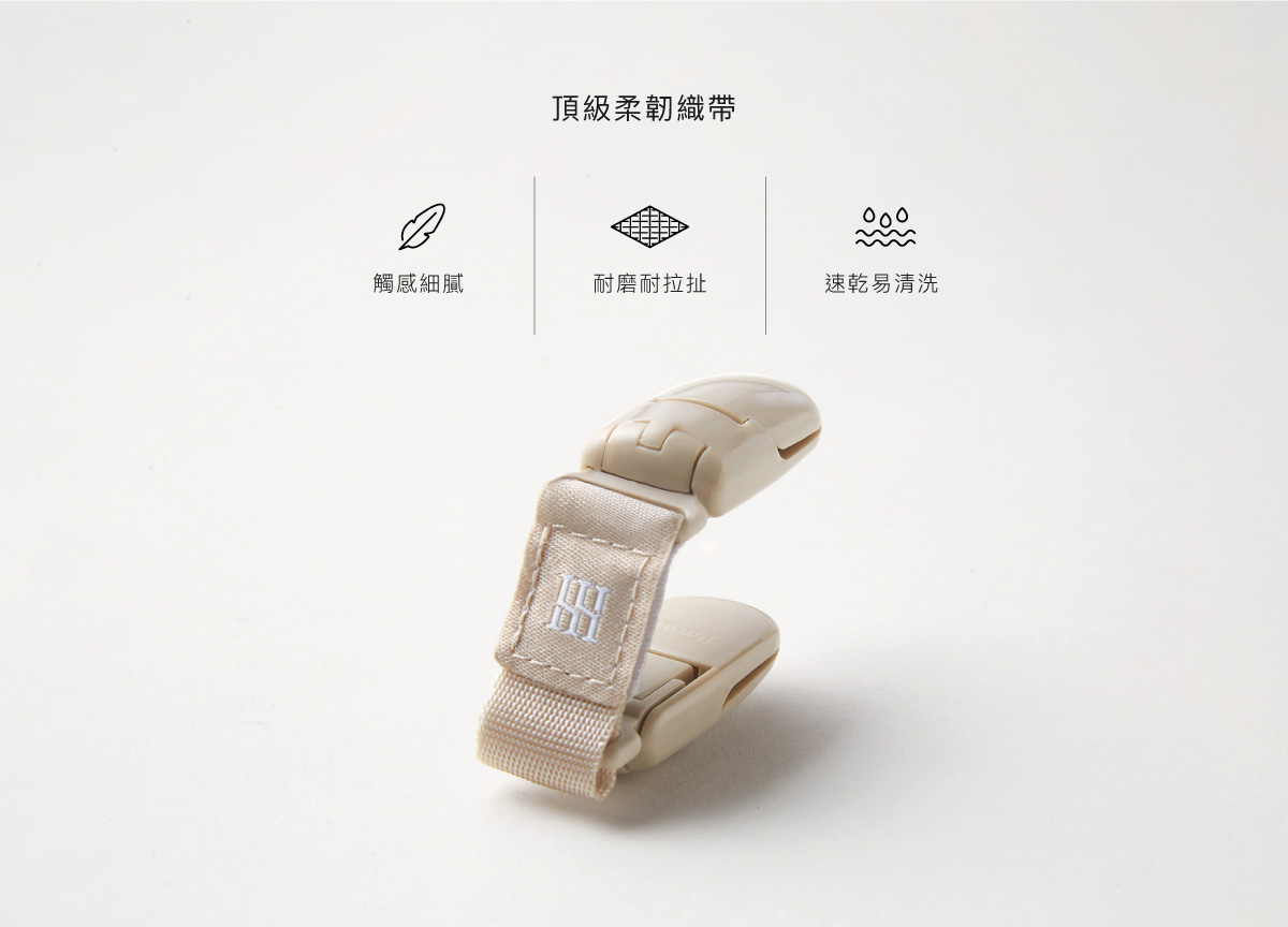 頂級柔韌織帶,觸感細膩、耐磨耐拉扯、速乾易清洗。