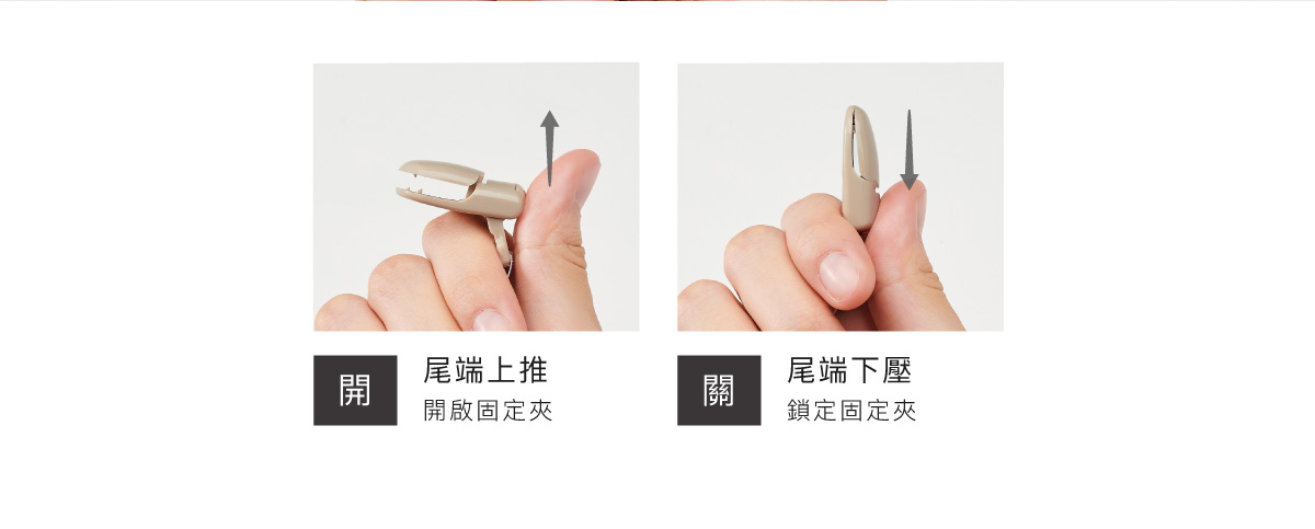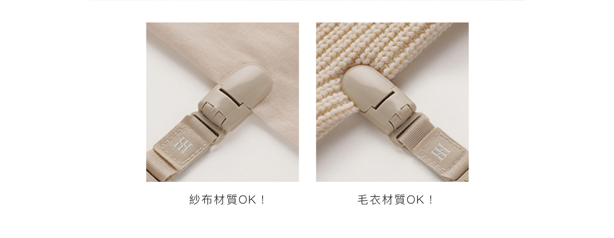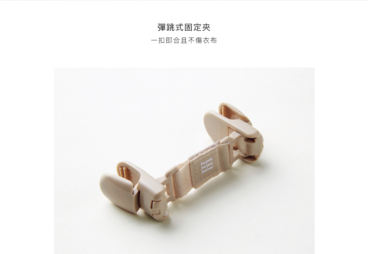 彈跳式固定夾,一扣即合且不傷衣布,厚薄衣物都能穩穩夾住。