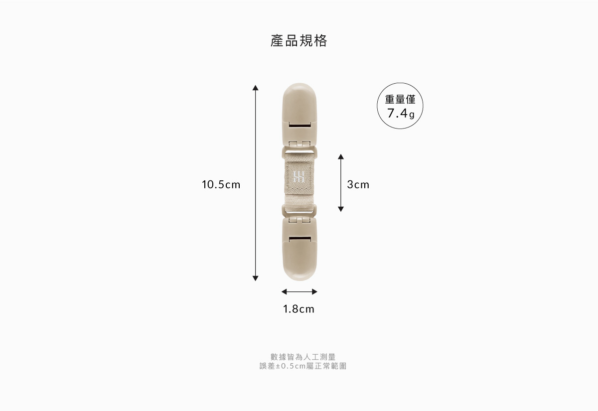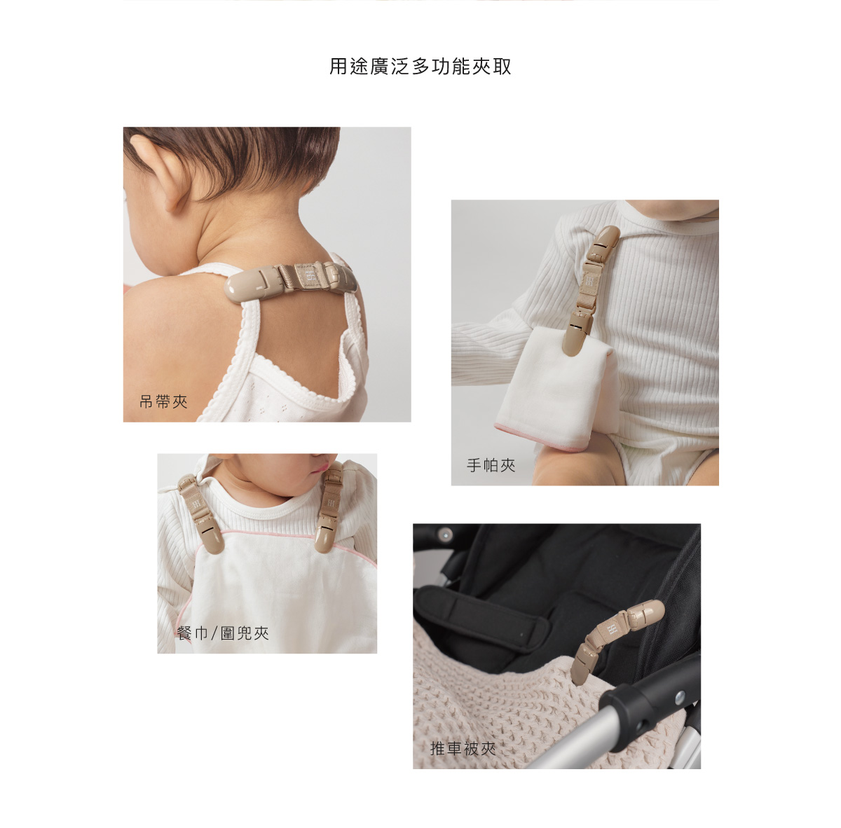 用途廣泛,可當吊帶夾、手帕夾、圍兜/餐巾夾、推車被夾等貼身小物。