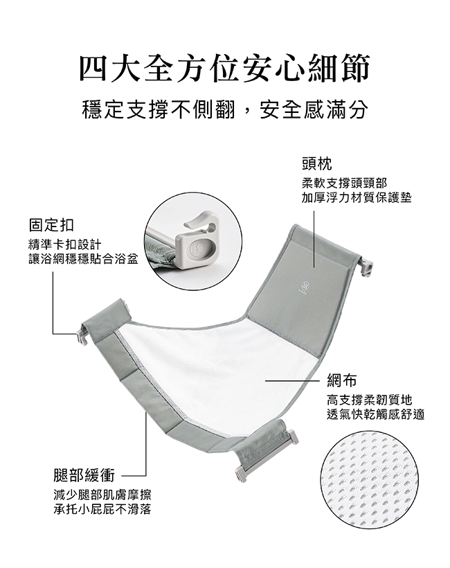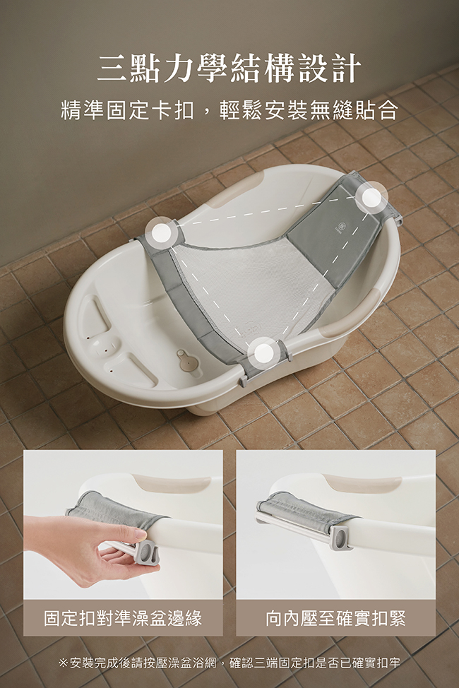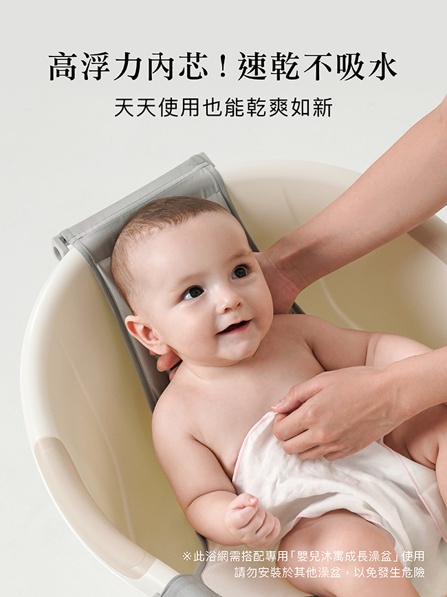 • 此浴網需另購「嬰兒沐寓成長澡盆」搭配使用,增強支撐與舒適度,讓寶寶洗澡更穩定安心。