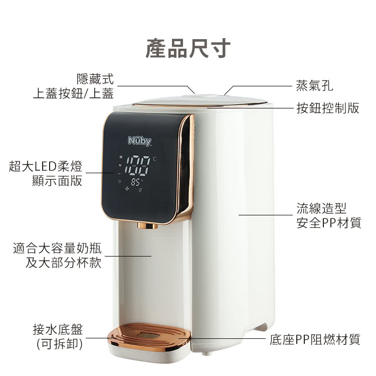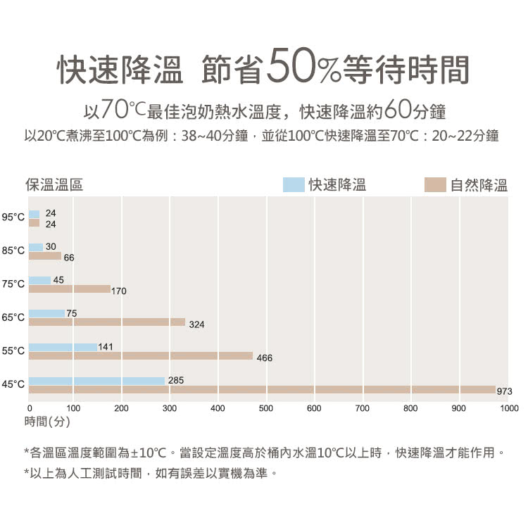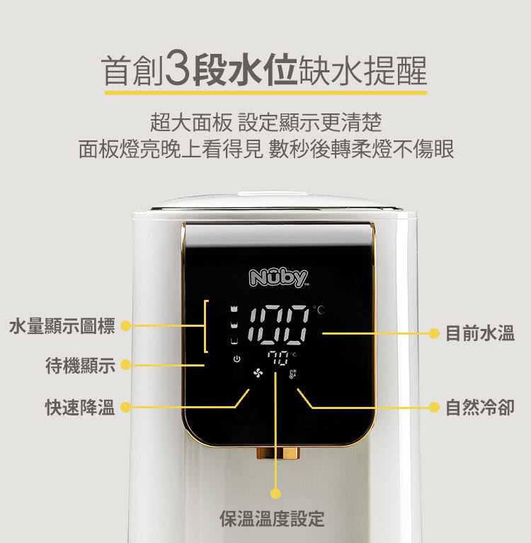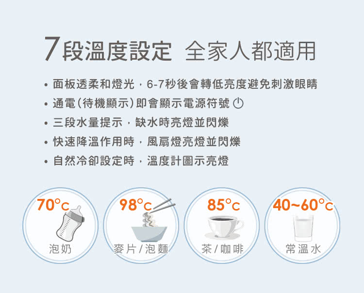 7 段式保溫溫度選擇 : 40°C,50°C,60°C,70°C,85°C,98°C, 常溫
