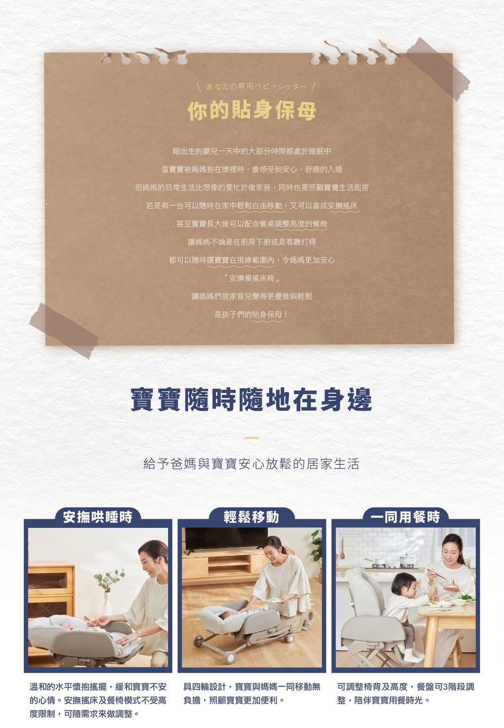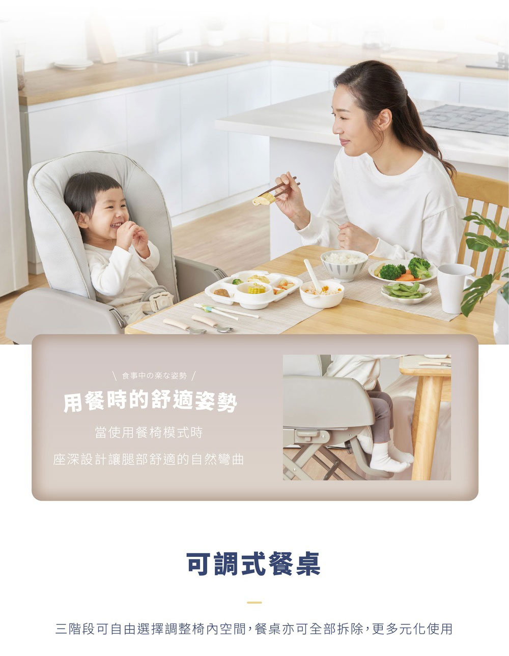 無論寶寶休息或用餐,高度皆有6段可供調整,並能輕鬆自由的移動,讓寶寶隨時隨地都可以在視線範圍內。