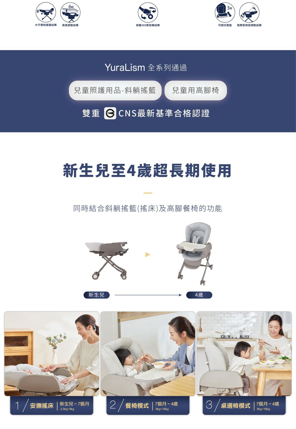 通過「兒童照護用品-斜躺搖籃」及「兒童用高腳椅」雙重CNS最新基準合格認證