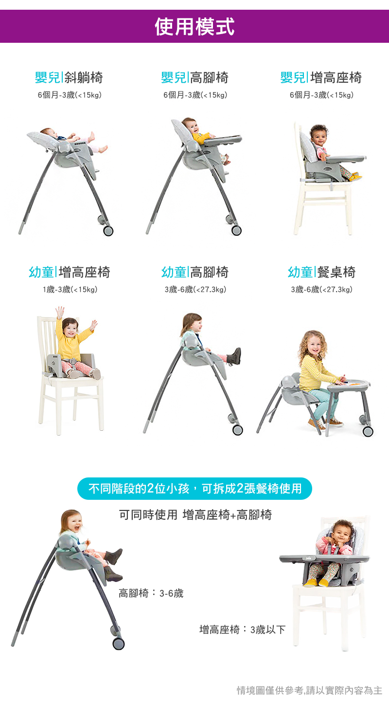 4.本產品作為幼童高腳椅、幼童餐椅模式及孩童組合餐椅模式使用時,僅適用於36個月以下、體重15公斤以下之孩童使用。