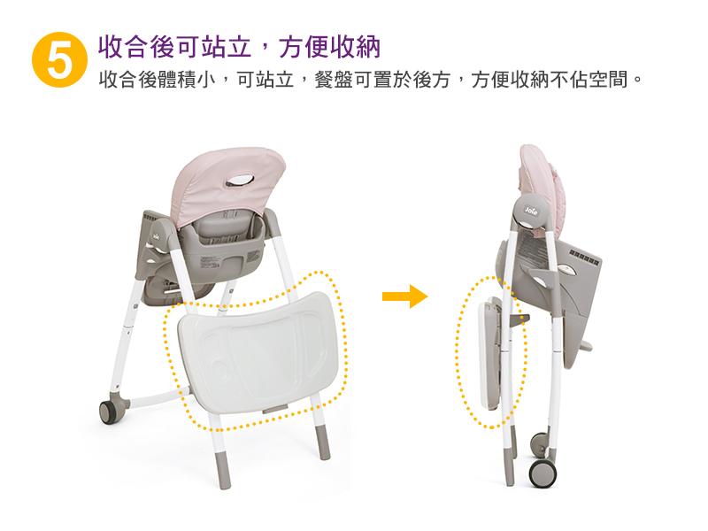 7. 聰明收納功能,餐盤可收納至椅腳位置。