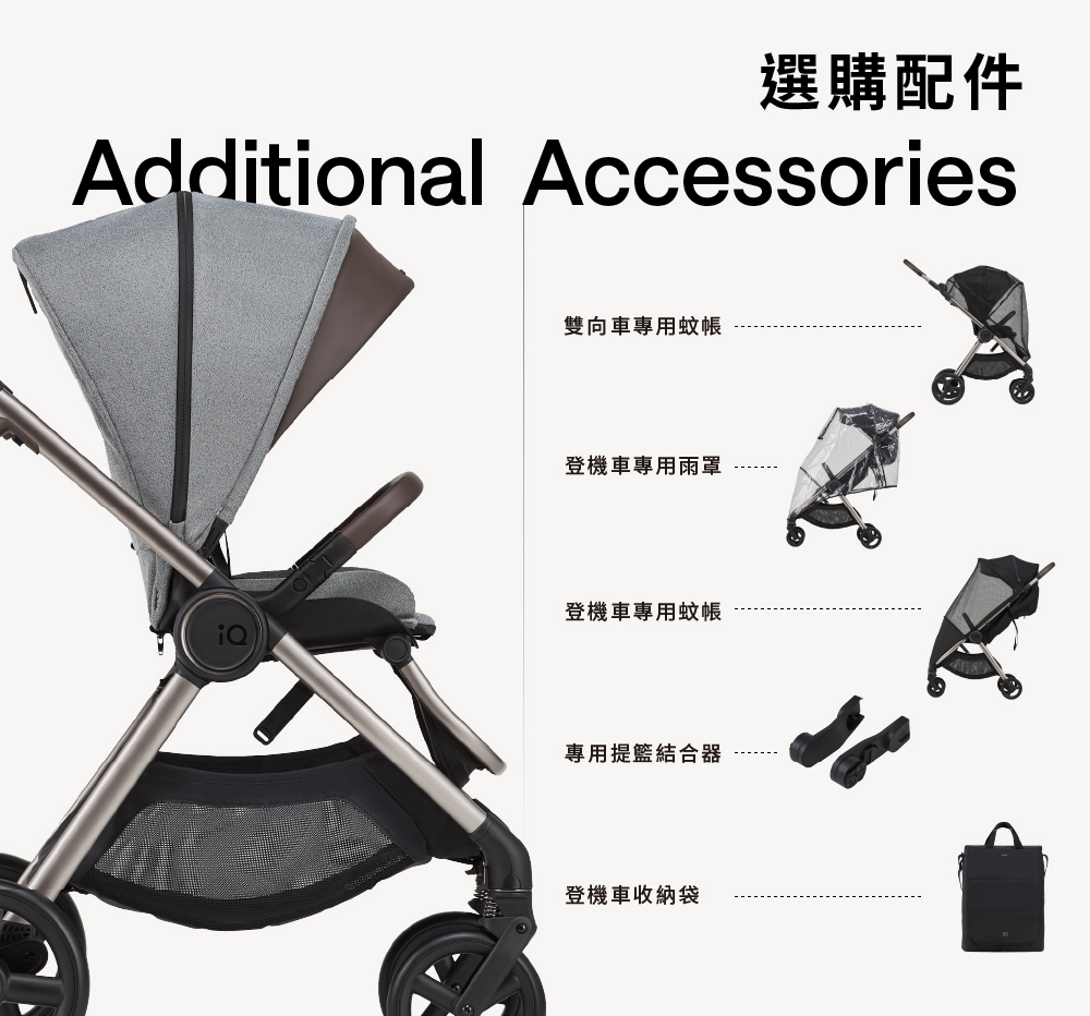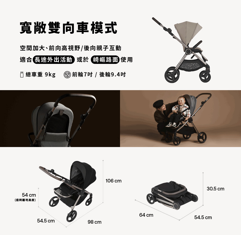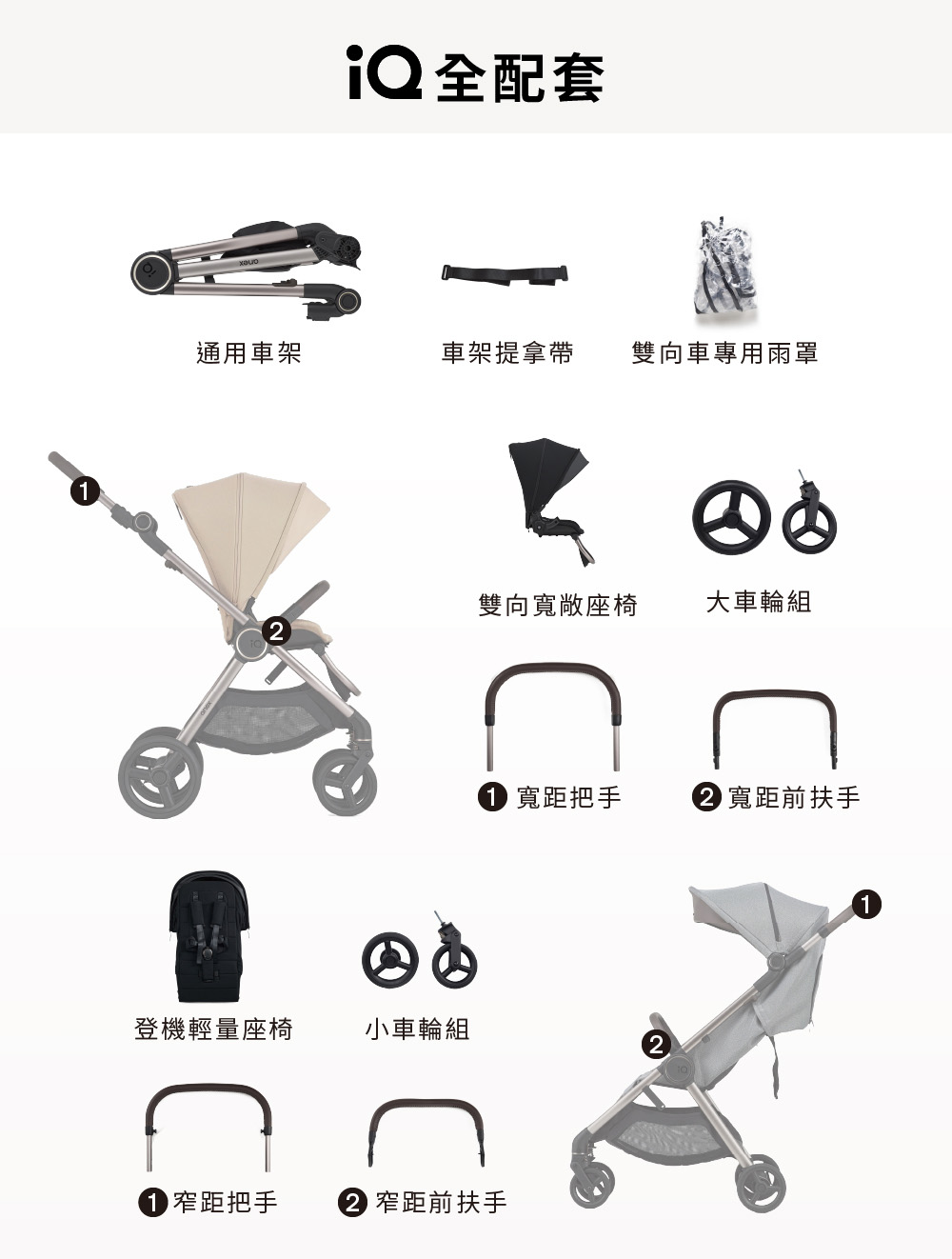 ┄ 雙向寬敞座椅、大車輪組、寬距把手、寬距前扶手、雙向車專用雨罩