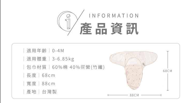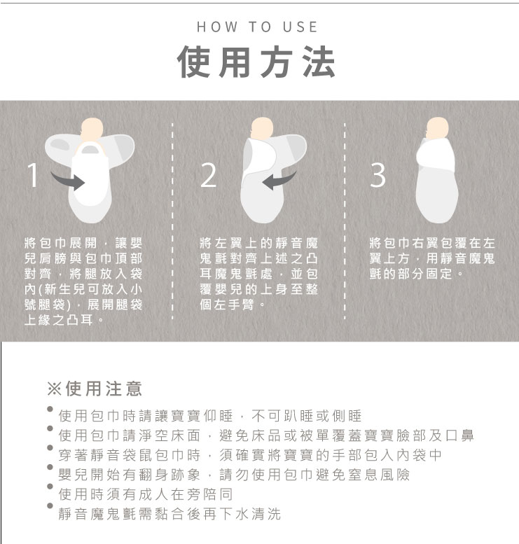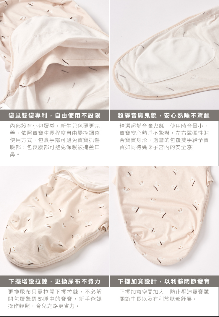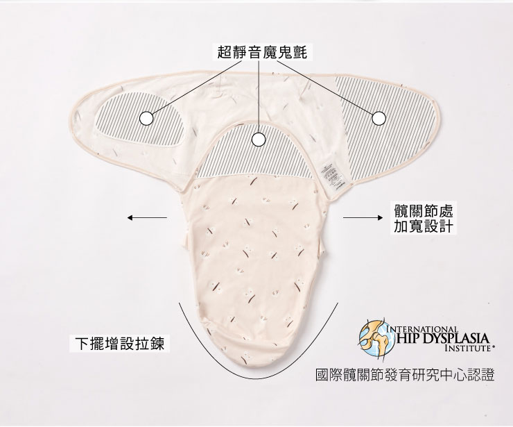 有別於傳統包巾,將操作複雜的包法簡化,模擬子宮內的環境緊緊包覆,讓寶寶安心睡過夜