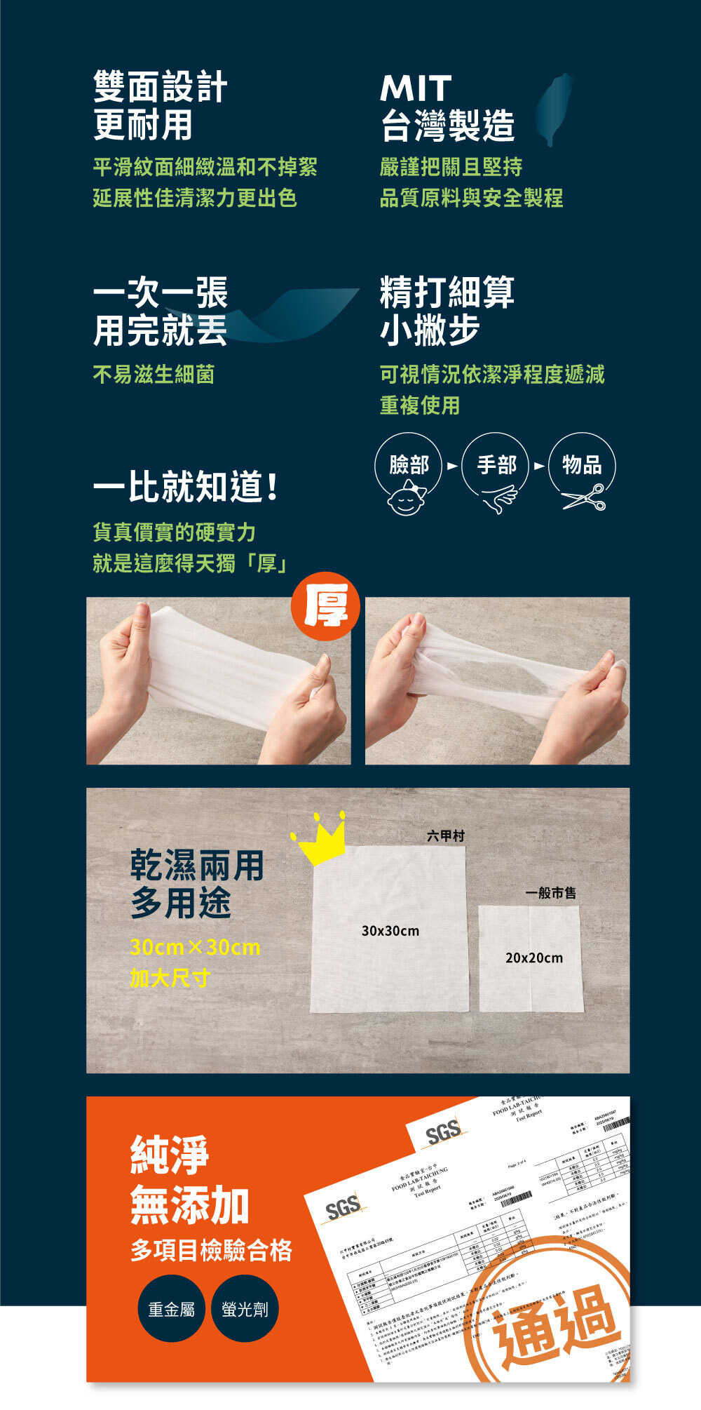 30cm×30cm加大尺寸,可依潔淨程度遞減重複使用 ( 臉部→手部→物品)