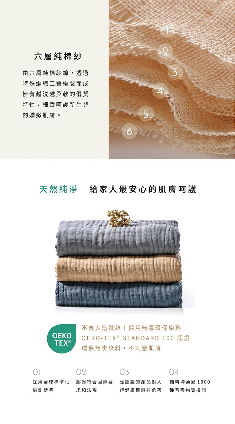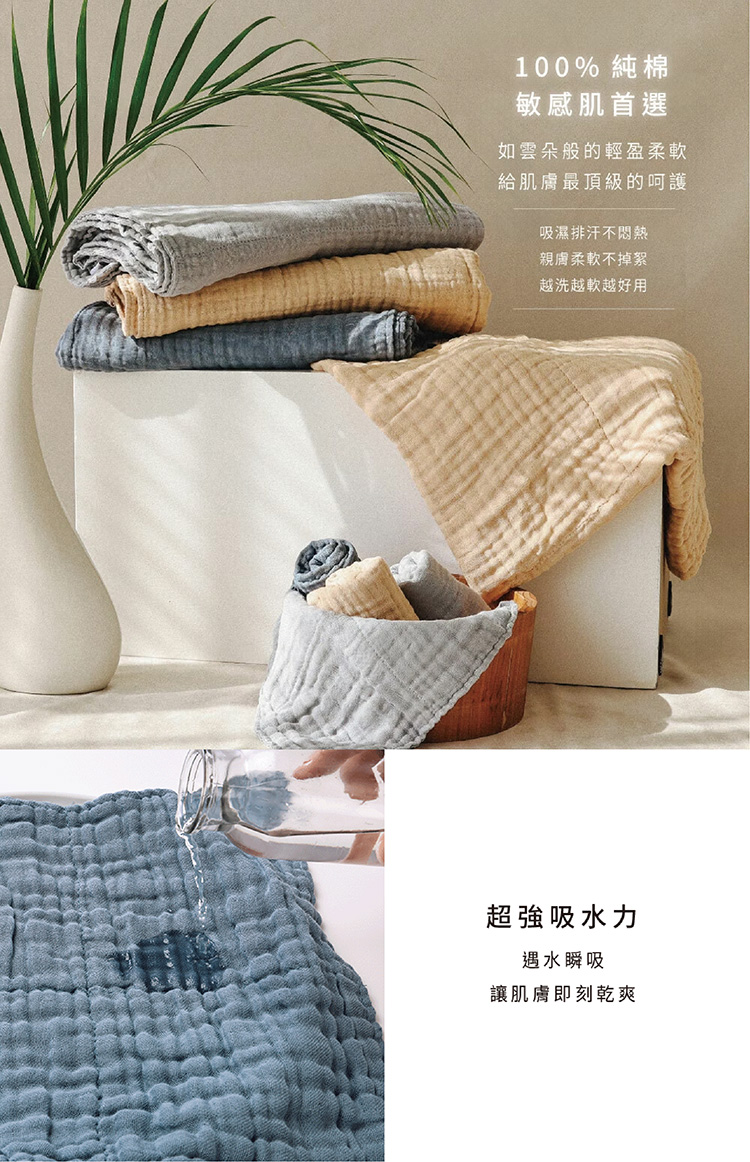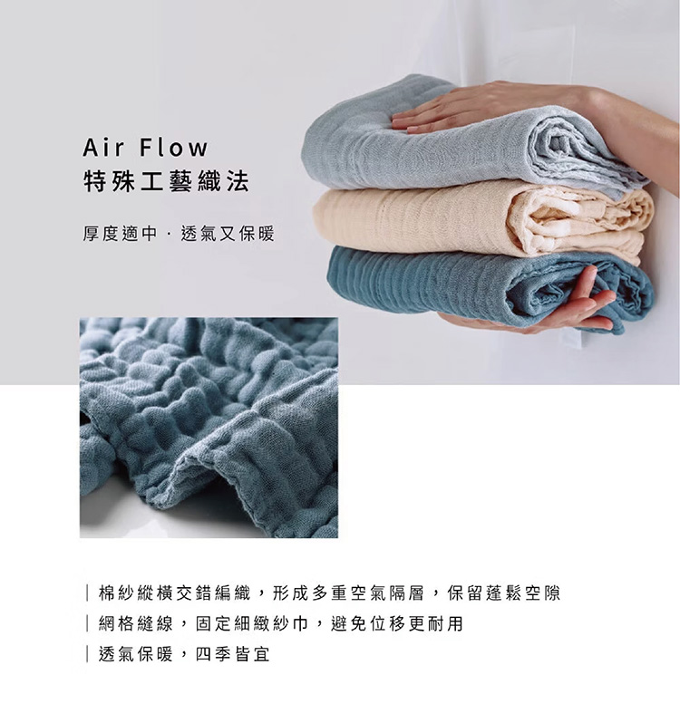 ●六層棉紗-由六層純綿紗線織成,形成多重空氣隔層,洗滌後觸感更加柔軟