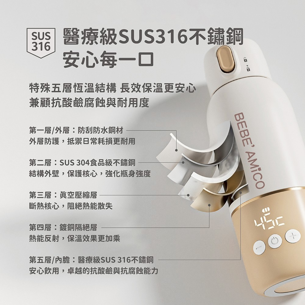 醫療級SUS316不鏽鋼,安心每一口。六段溫控隨心切換,1°C精準微調,從茶水到70°C泡奶,一鍵到餵,外出沖泡從容育兒。一瓶多用,出門一杯輕鬆搞定。