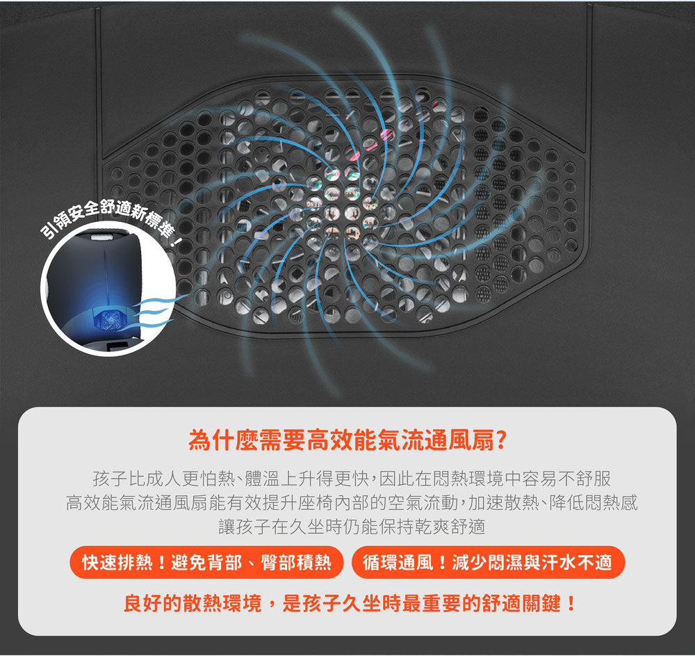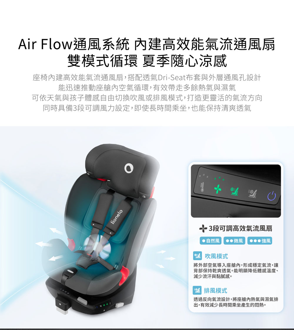 結合「風扇暖座雙控 」與「智能安裝指示燈」,不論夏季酷熱或冬日寒冷,也能保持座椅內舒適恆溫,呵護每一程旅途!從新生兒到12歲都能舒適乘坐!