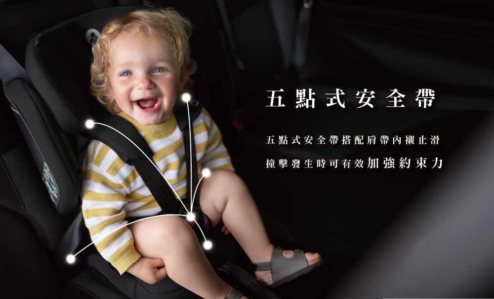 五點式安全帶搭配止滑內襯,撞擊發生可提升安全帶約束力