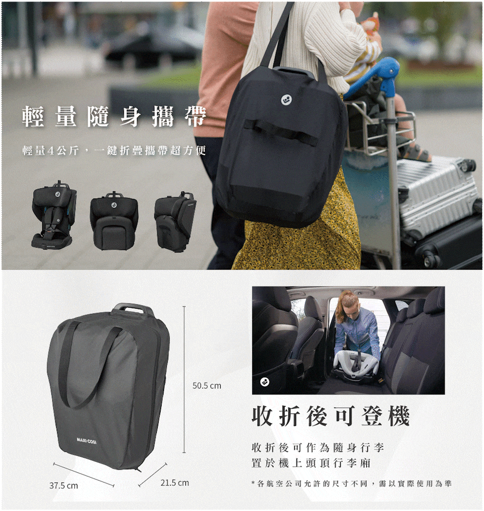 輕巧4.2公斤,按壓一鍵即可收折,收後可置於機上頭頂行李箱。 (各航空公司規範尺寸不同,需以實際使用為準)