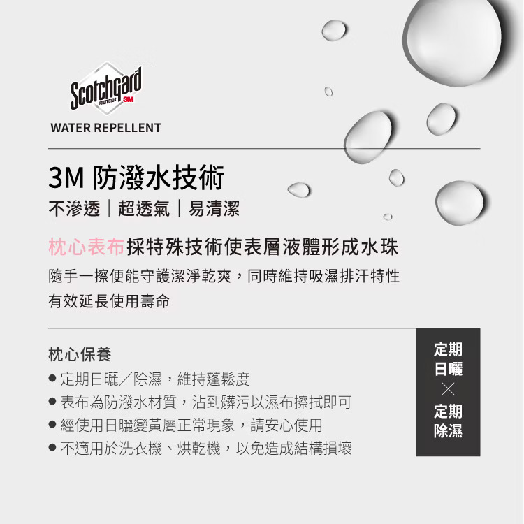 ・採用3MScotchGard防潑水技術。阻隔溼氣使枕心持久蓬鬆,遇水擦拭輕鬆保養