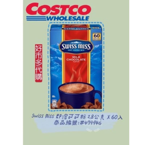 單盒購買會以原包裝出貨 介意者勿下單 Swiss Miss 即溶可可粉 28公克 X 60入 Swiss Miss Hot Cocoa Mix Milk Chocolate Flavor 28 g X 60 Count 商品編號:#479946 好市多代購可可粉 濃郁香味及滑順口感 進口可可亞及新鮮牛乳製成 熱水沖泡即可飲用 添加冰塊做成冷飲也很適合 品名 Swiss Miss 即溶可可粉 28公克 X 60入 內容量/入數 28公克 X 60入 商品重量 1.68公斤 商品尺寸 長27.5公分 X 寬18公分 X 高12.8公分 成分 糖, 葡萄糖漿, 加工乳清, 可可, 氫化椰子油, 脫脂奶粉 , 鹽, 磷酸氫二鉀, 脂肪酸甘油酯, 鹿角菜膠, 人工香草香料。 使用方式 一般沖泡:取一空杯,加入一包Swiss Miss 即溶可可粉,注入6盎司(3/4杯)熱水(非沸騰開水) 攪拌均勻後即可飲用。 微波爐加熱沖泡:取一空杯,加入一包Swiss Miss 即溶可可粉,再另取一個可供微波爐使用的杯子,倒入6盎司(3/4杯)的牛奶或水,以高功率加熱約1-1.5分鐘,或直至水熱(但不需滾燙)。最後,將牛奶或水邊攪拌邊倒入已裝有可可粉的杯中,攪拌均勻後即可飲用。 保存方式 請存於乾燥陰涼處,開封後請儘速食用完畢 保存期限 以消費者收受日起算,至少距有效日期前30日以上 產地 美國 食品業登錄字號 A-196972798-00031-9 產品責任險契約字號 CXCD 38090501 004 過敏原資訊 本產品含有牛奶,食物過敏者請留意。 製造/進口商名稱 好市多股份有限公司 製造/進口商電話 449-9909(手機撥打請加02) 製造/進口商地址 高雄市中華五路656號 注意事項 為獲得最佳效果,請勿使用滾燙的開水。 欲享用更香醇濃郁的可可亞,可使用牛奶代替水沖泡。 為獲得最佳效果:請勿使用滾燙的開水。 欲享用更香醇濃郁的可可亞,可使用牛奶代替水沖泡。 建議沖泡方式:一般沖泡:取一空杯,加入一包Swiss Miss 即溶可可粉,注入6盎司(3/4杯)熱水(非沸騰開水) 攪拌均勻後即可飲用。微波爐加熱沖泡:取一空杯,加入一包Swiss Miss 即溶可可粉,再另取一個可供微波爐使用的杯子,倒入6盎司(3/4杯)的牛奶或水,以高功率加熱約1-1.5分鐘,或直至水熱(但不需滾燙)。最後,將牛奶或水邊攪拌邊倒入已裝有可可粉的杯中,攪拌均勻後即可飲用。 請注意 : 本產品含有牛奶,食物過敏者請留意。☺️